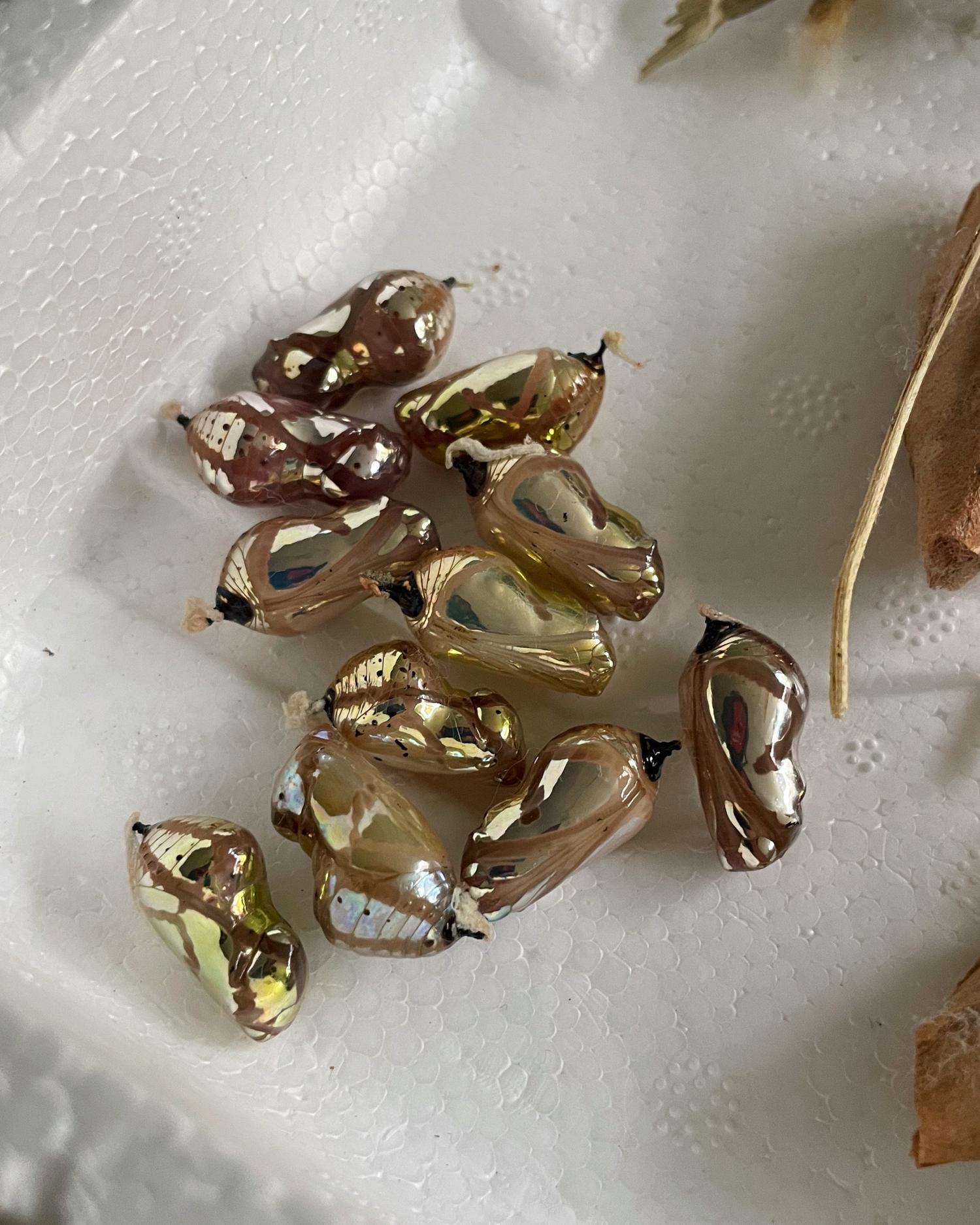 The beautiful metallic pupae of the Common Crow butterfly look like drops of silver and gold!