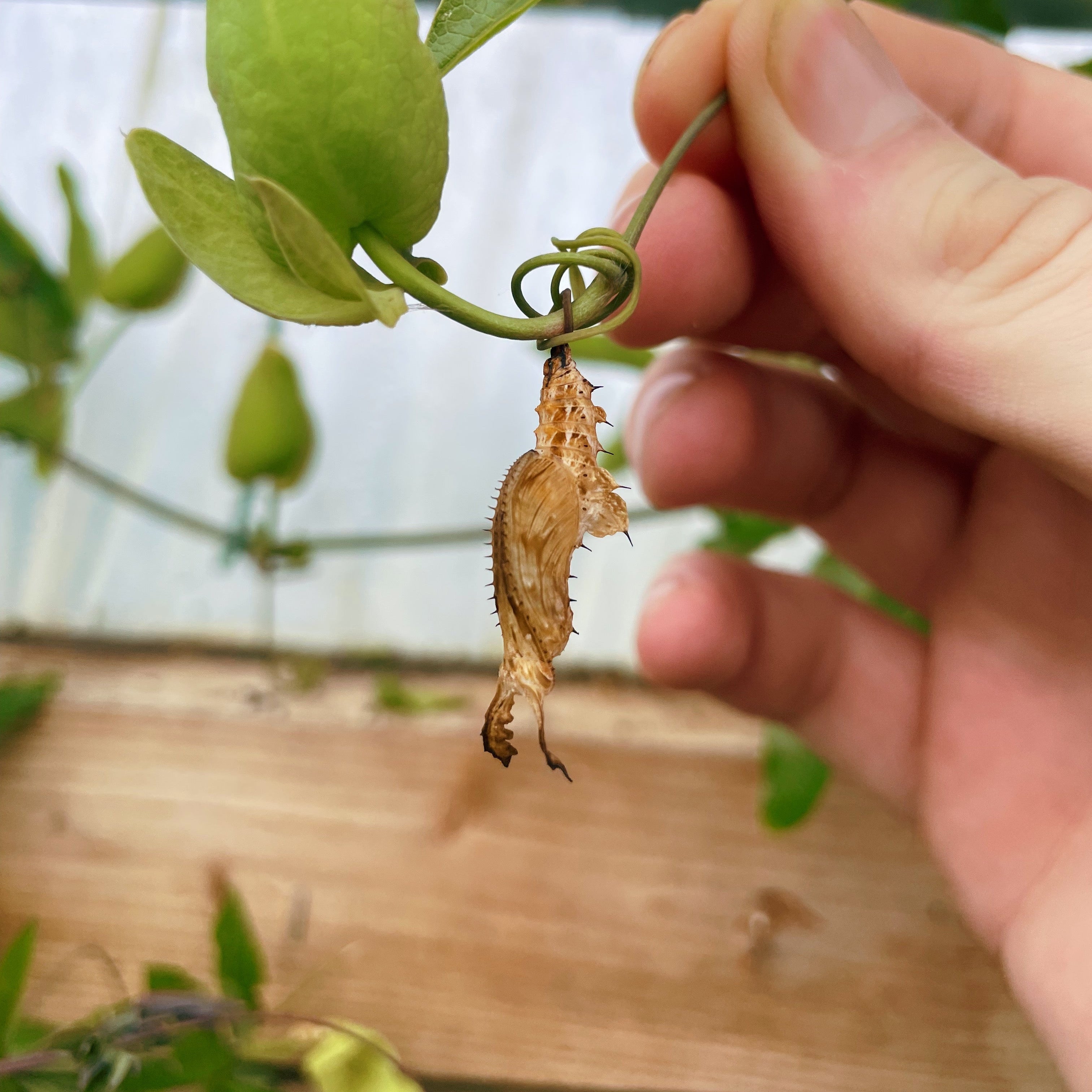 Longwing pupae are distinctive, often adorned with small spines that resemble dead foliage — an excellent natural camouflage.