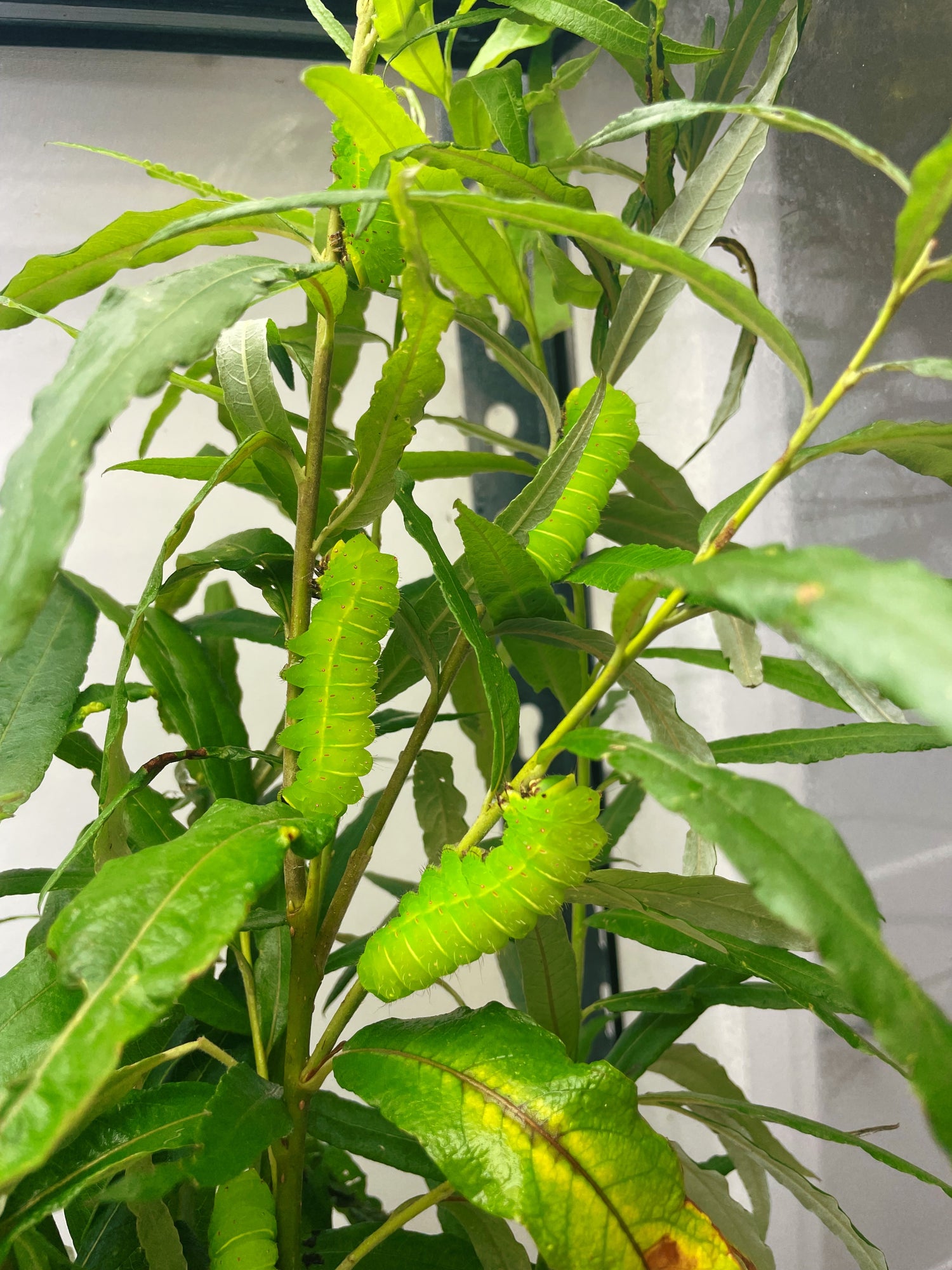 These two larvae are in the fifth instar and nearly ready to pupate - the orange/brown one has begun to search for a pupation site and will shortly begin to construct a cocoon.
