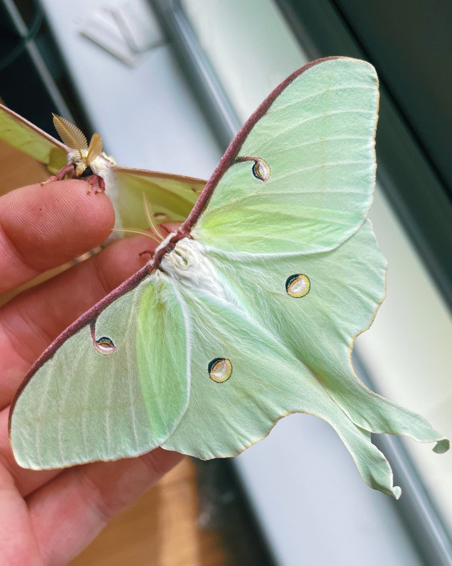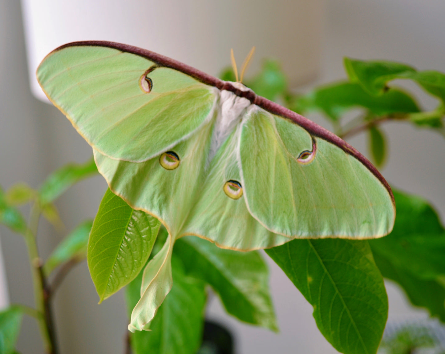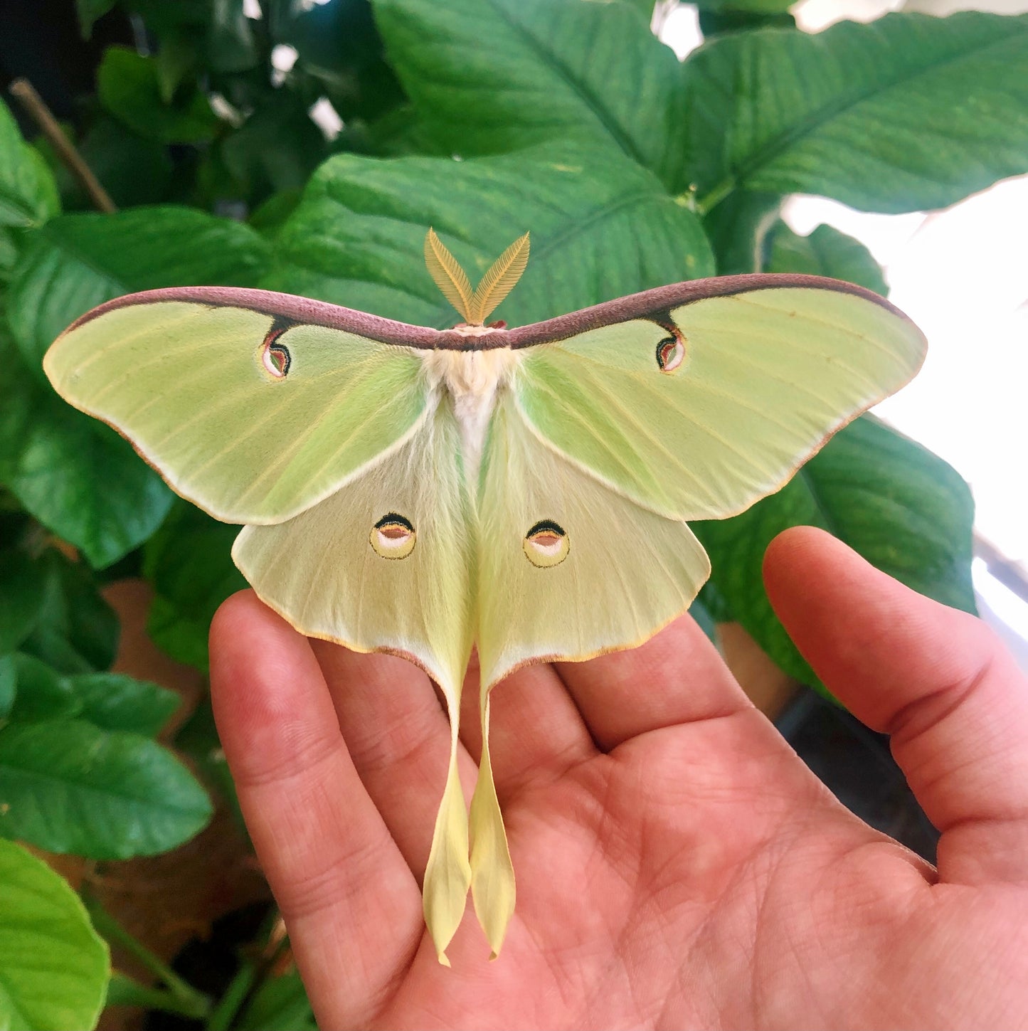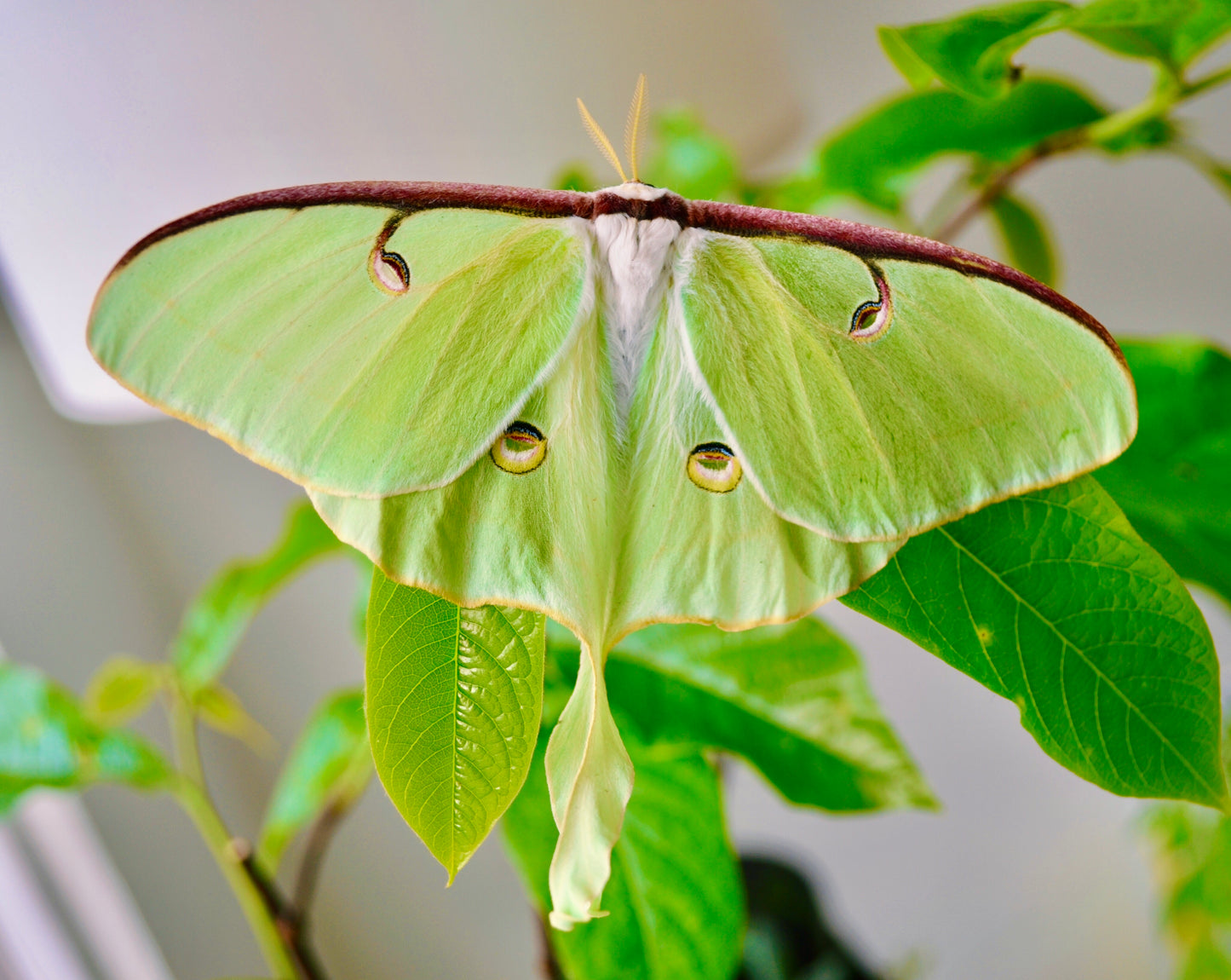 The luna moth has a wingspan of up to 15cm, making it one of the largest moths in North America. Its most notable features are its pale green wings, long tapering hindwing tails, and eye-like markings on each wing. These eyespots help deter predators by mimicking the eyes of larger animals.