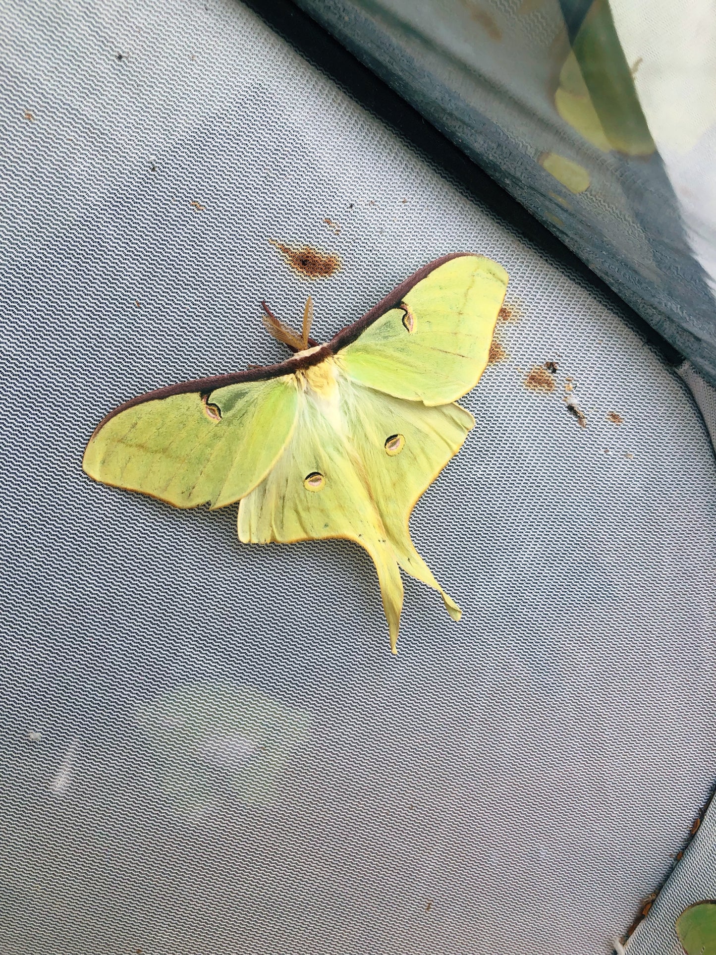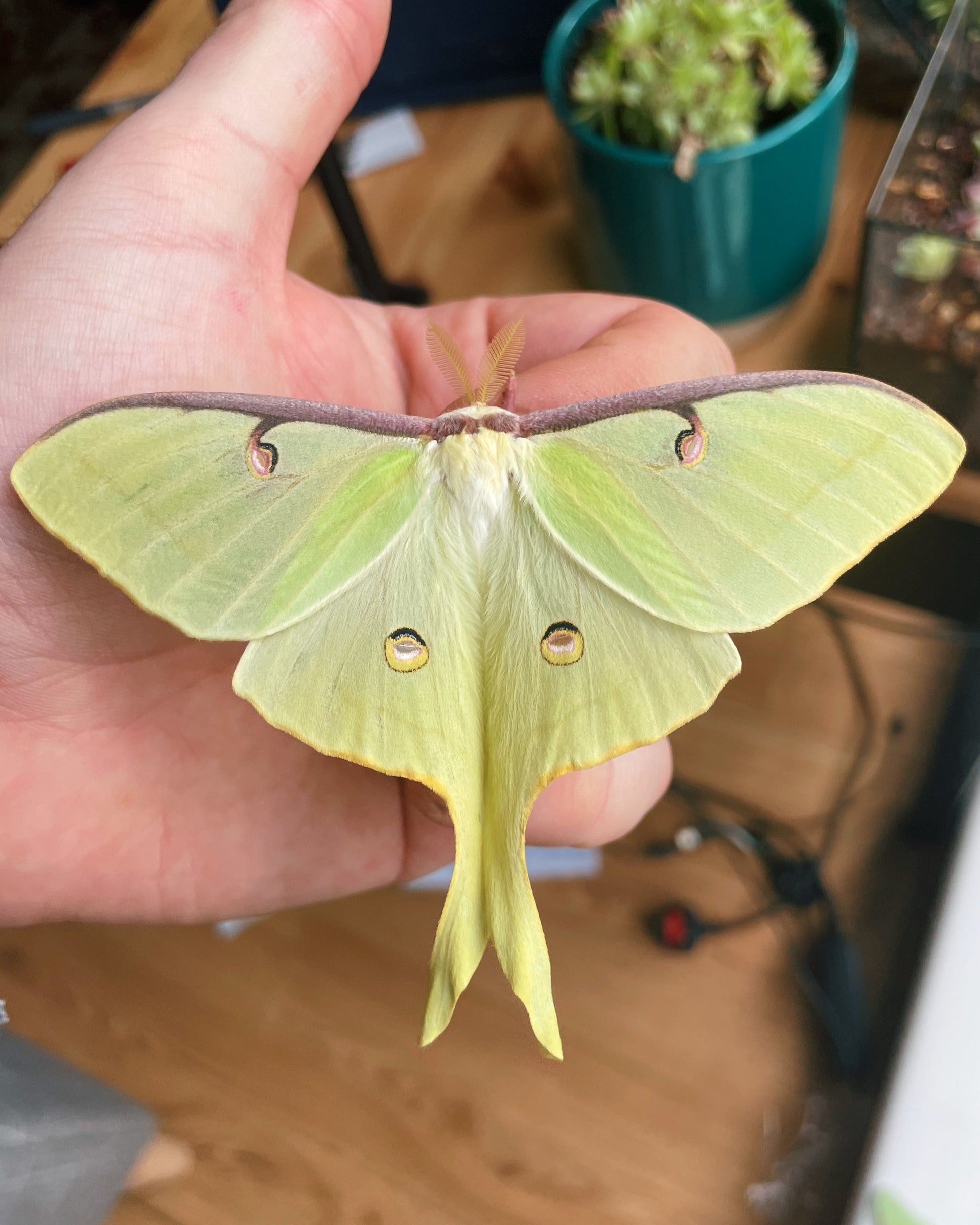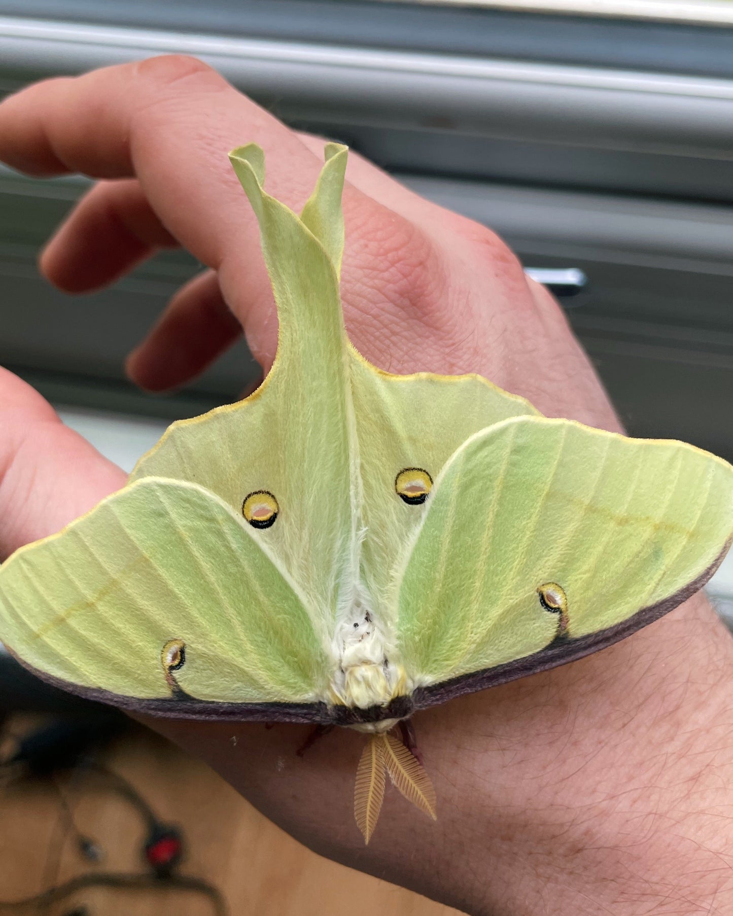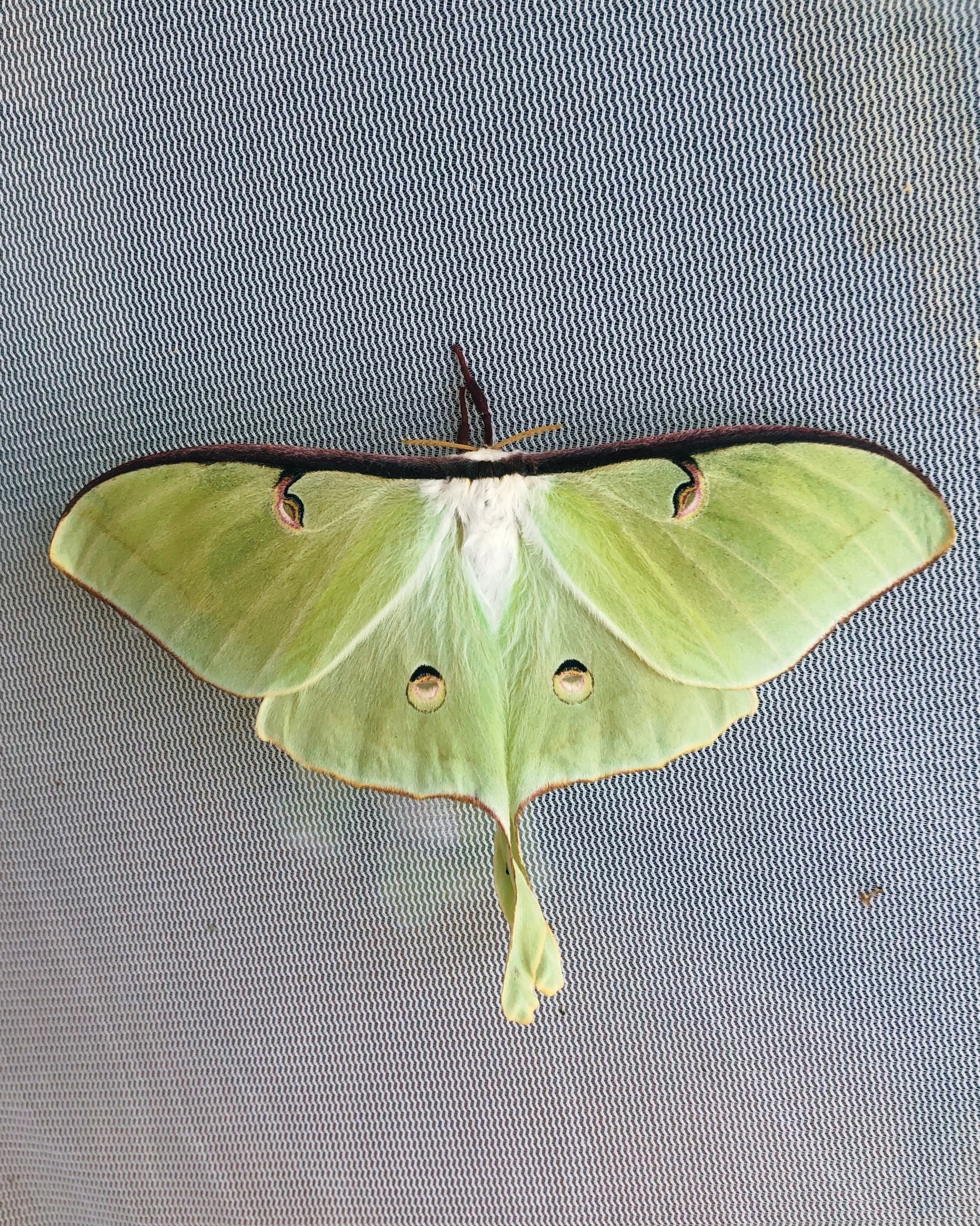 The luna moth has a wingspan of up to 15cm, making it one of the largest moths in North America. Its most notable features are its pale green wings, long tapering hindwing tails, and eye-like markings on each wing. These eyespots help deter predators by mimicking the eyes of larger animals.