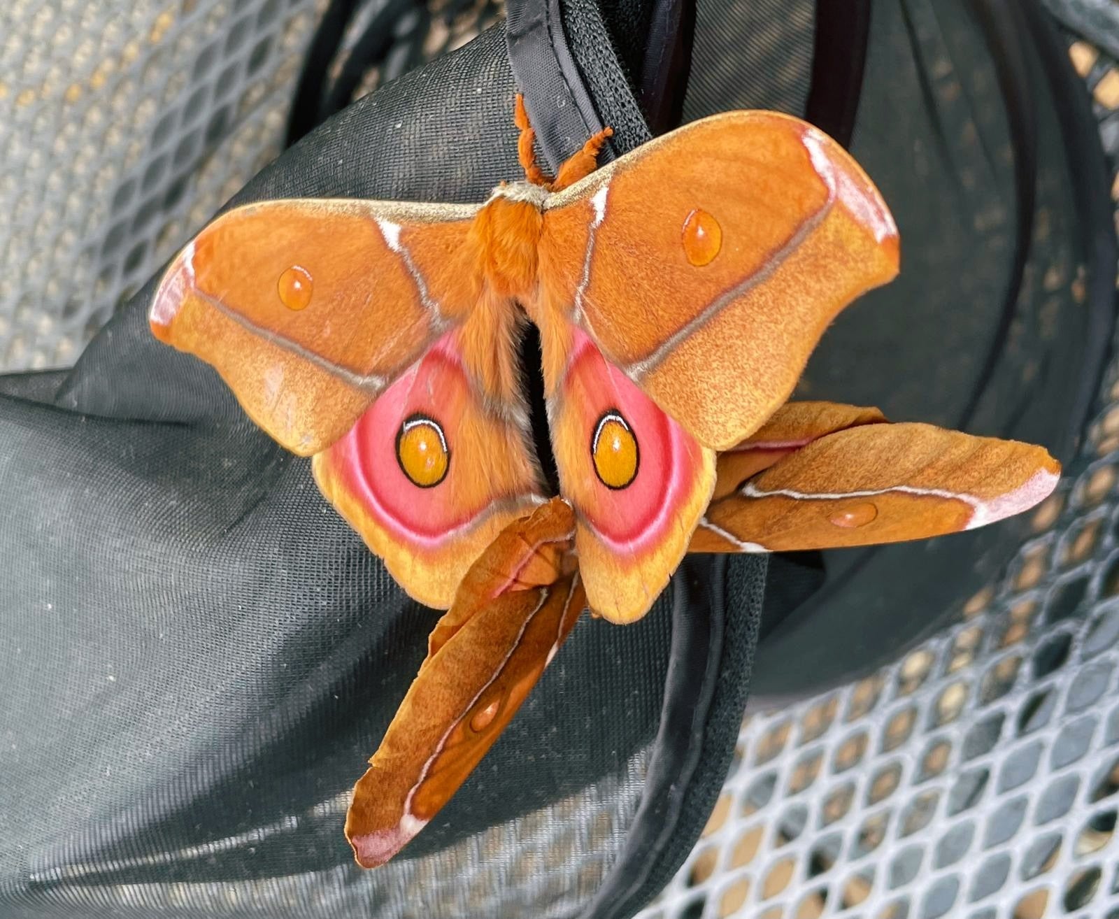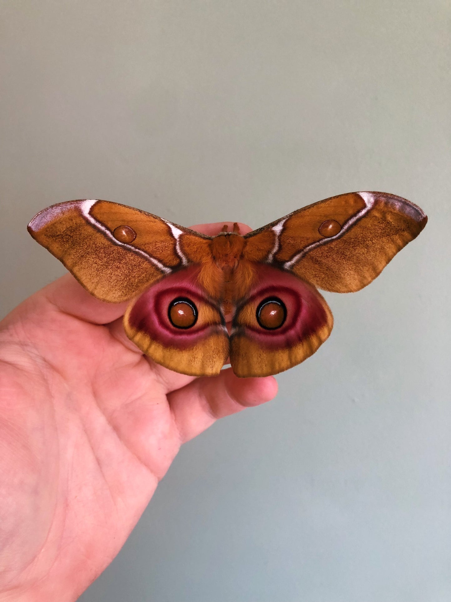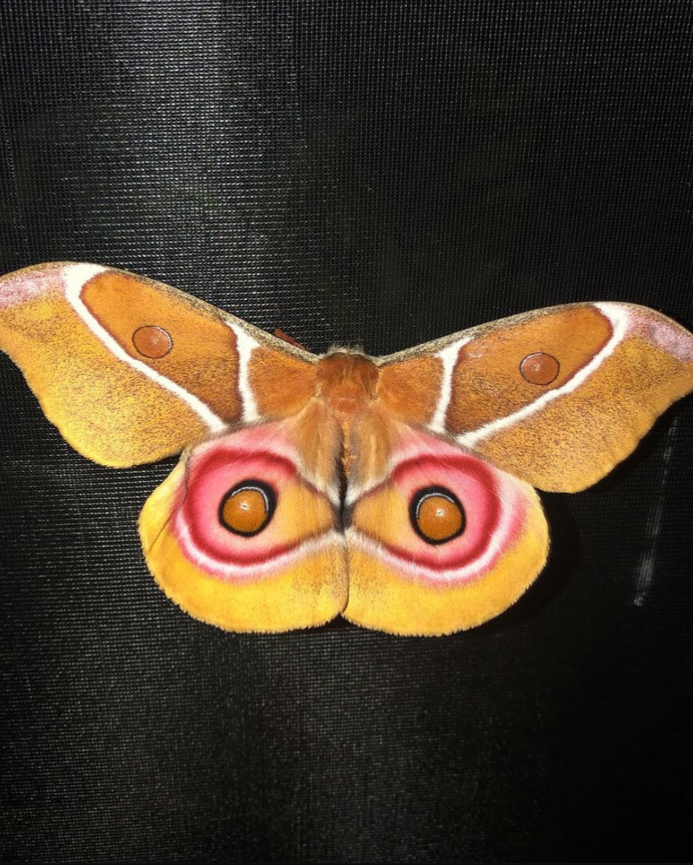 The adult moth is notable for its striking wing patterns and colors. Its wingspan typically ranges between 10 to 15 cm. The forewings are a mix of soft pink, orange, and brown hues with intricate markings, while the hindwings display large, prominent eye spots. These eyespots serve as a defense mechanism, startling predators by mimicking the eyes of larger animals.