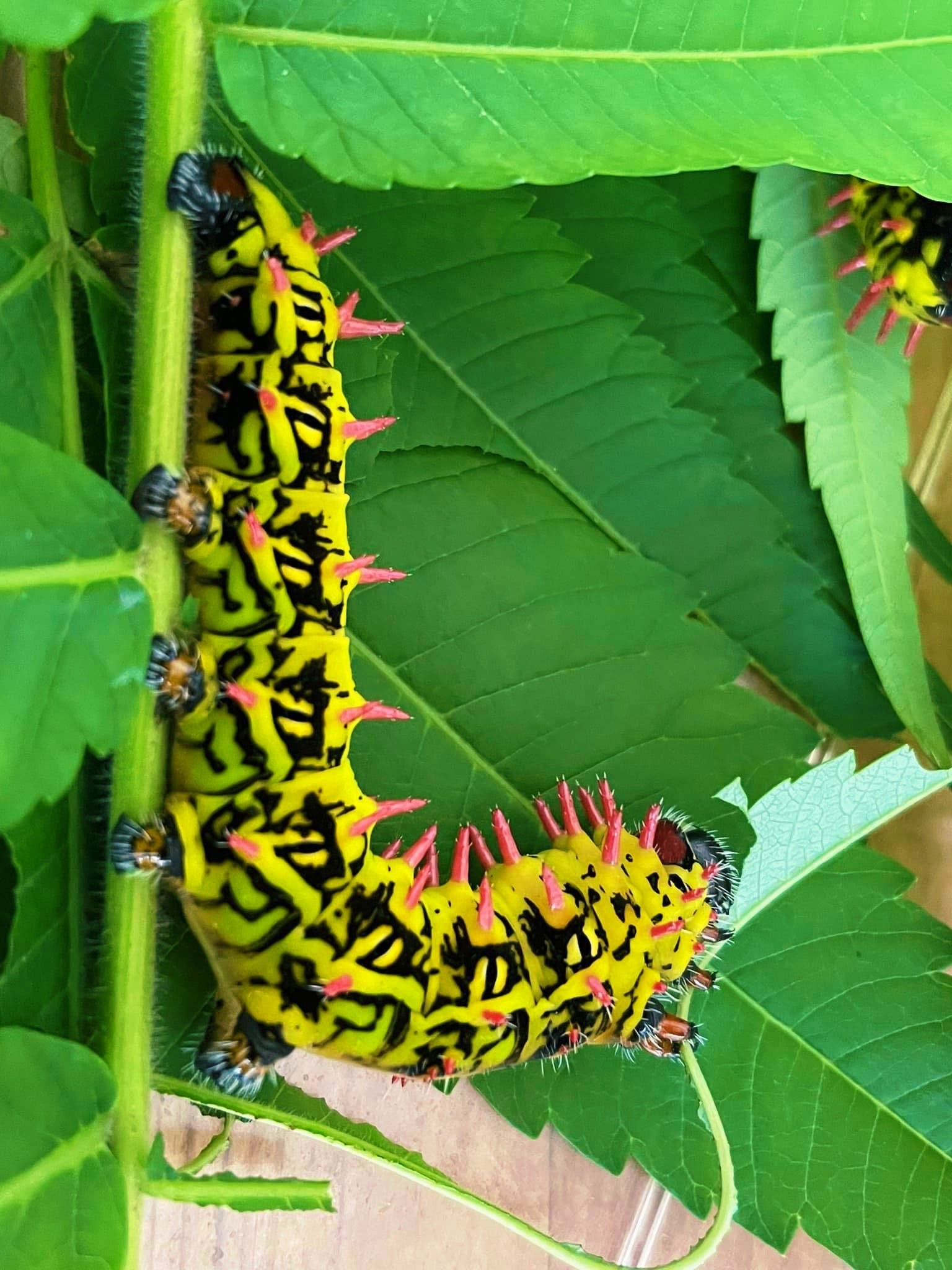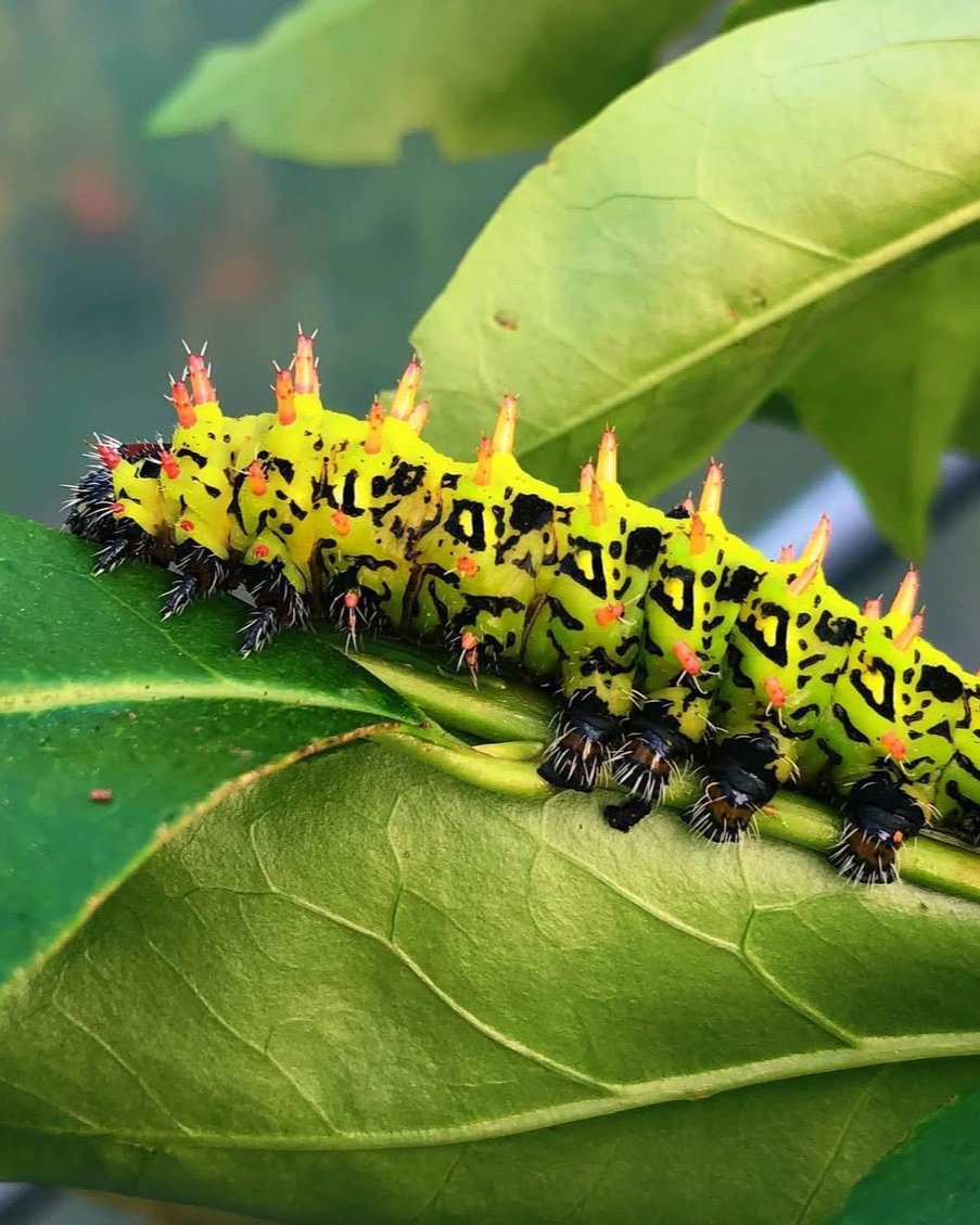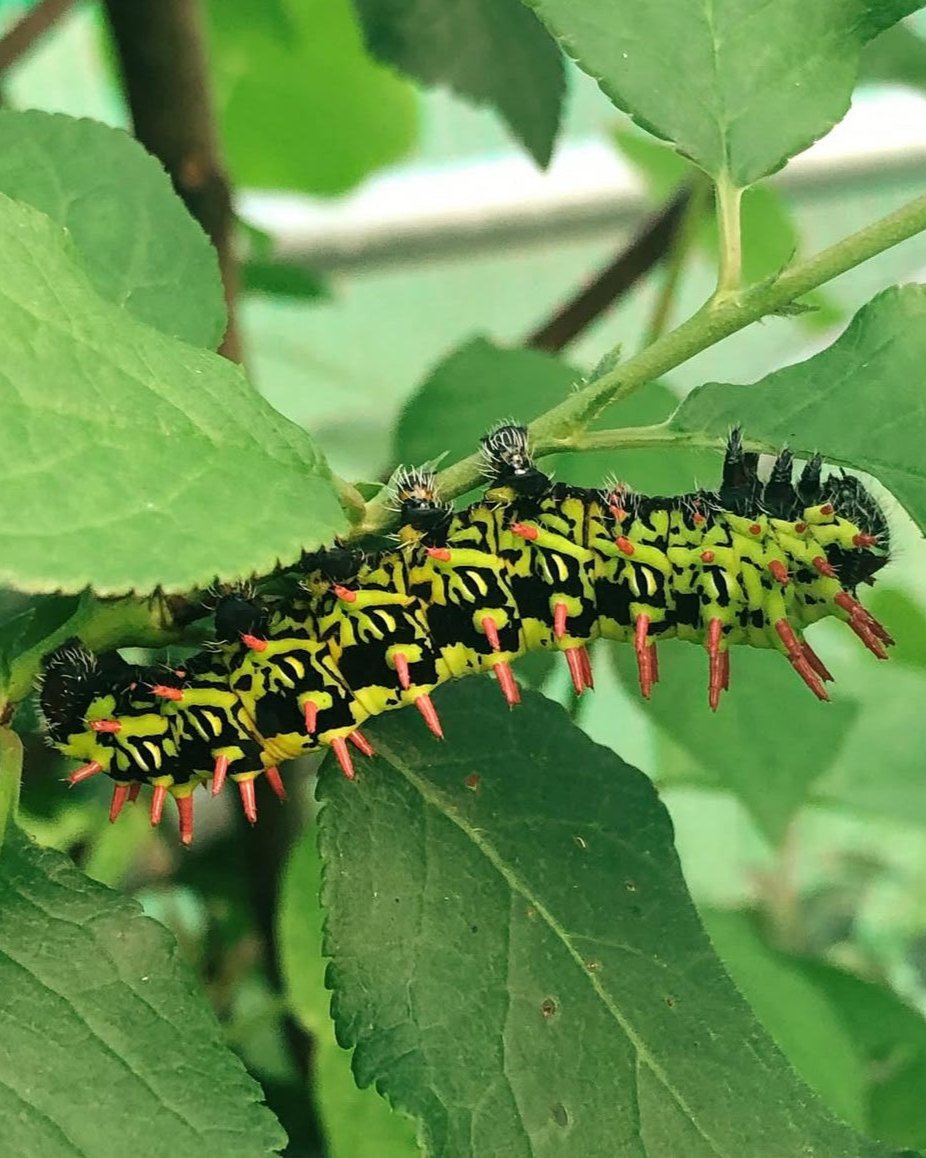 The caterpillars are vibrant green with small spines and feed on a variety of local host plants, however they also gladly accept many typical host plants in captivity. After the caterpillar matures, it spins a web-like silken cocoon where it pupates and emerges as an adult around one month later.