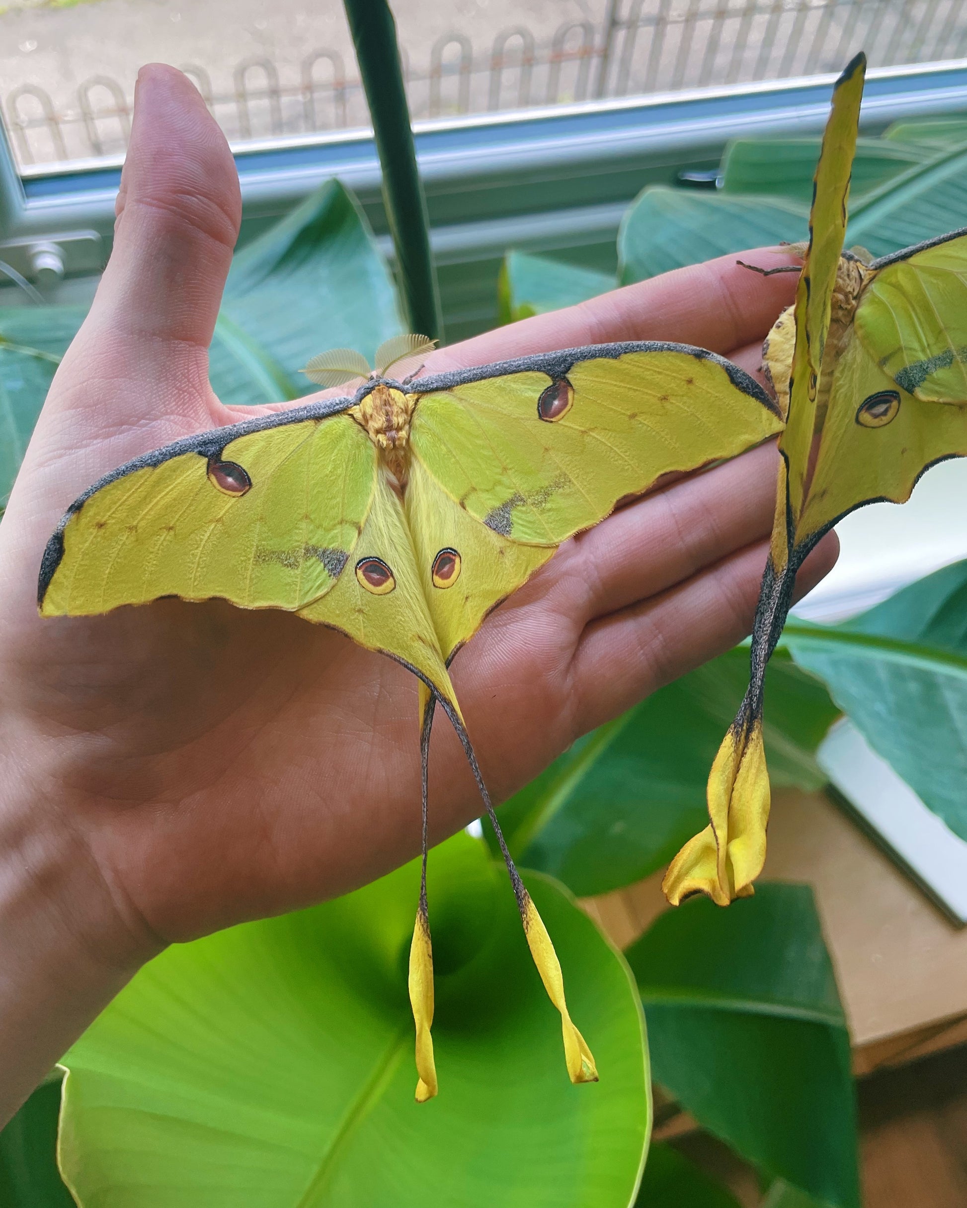 Like the moths, caterpillars are either bright green or yellow in colour. The caterpillars enjoy some additional warmth, e.g. a warm room or cupboard, although this is not necessary in the summer, nor is it necessary for cocoons which are very tough and resilient. If you have not reared these before, I highly recommend trying them just to see the caterpillars! Cocoons are very easy to hatch out, simply requiring a daily misting, though patience is sometimes required as they can remain in this stage for several weeks or even months if temperatures or humidity are unsuitable!