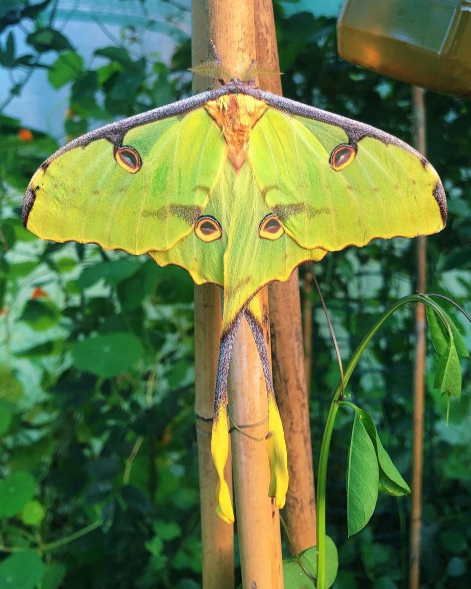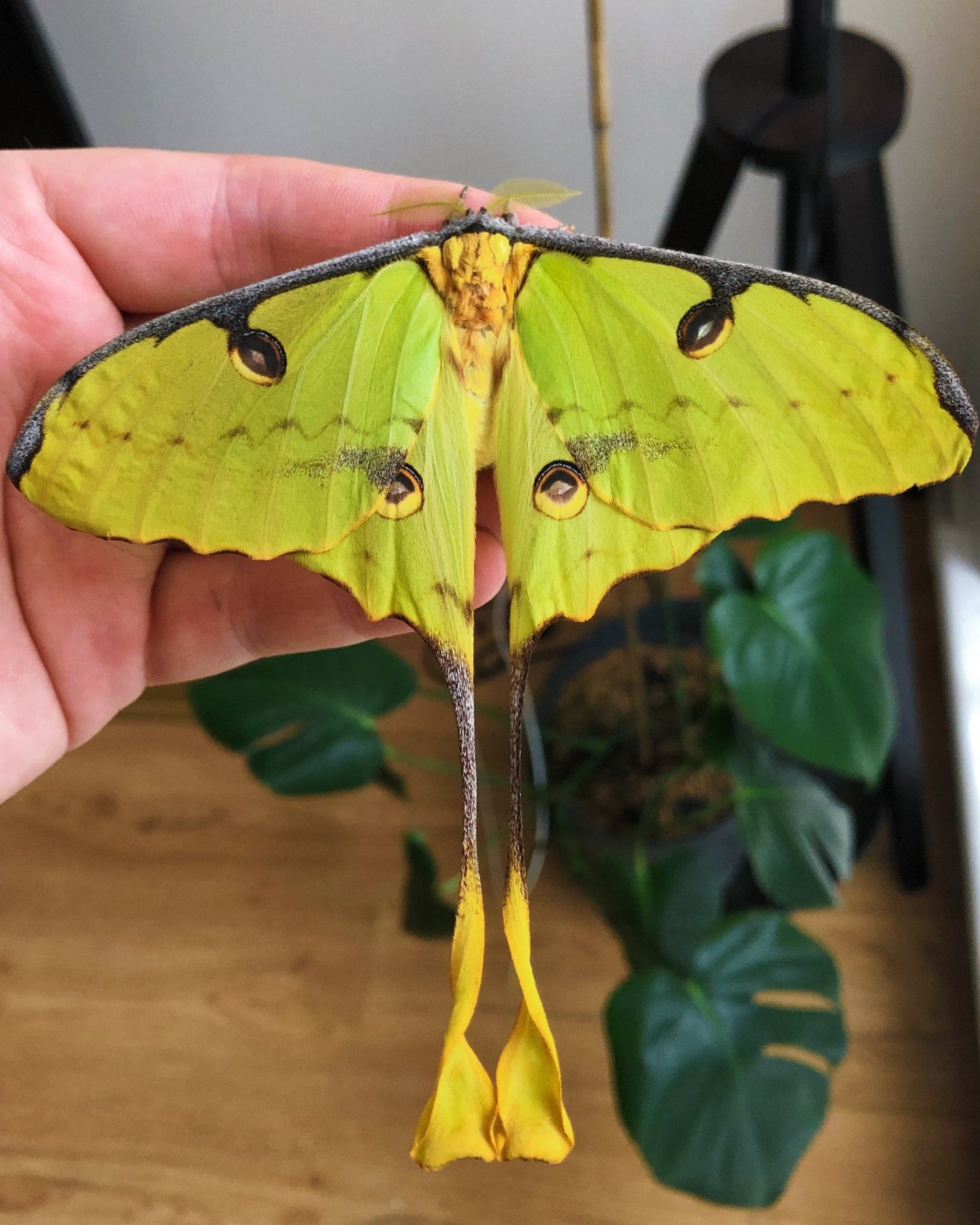 The African comet moth (Argema mimosae), also known as the African moon moth, is a large and striking silk moth native to sub-Saharan Africa. This species is famous for its vibrant green or yellow wings, adorned with eye-like markings, and its distinctive long, tail-like extensions, which can help confuse predators. Adult moths have a wingspan of up to 15 cm, with males possessing longer tails and more angular wings than females.