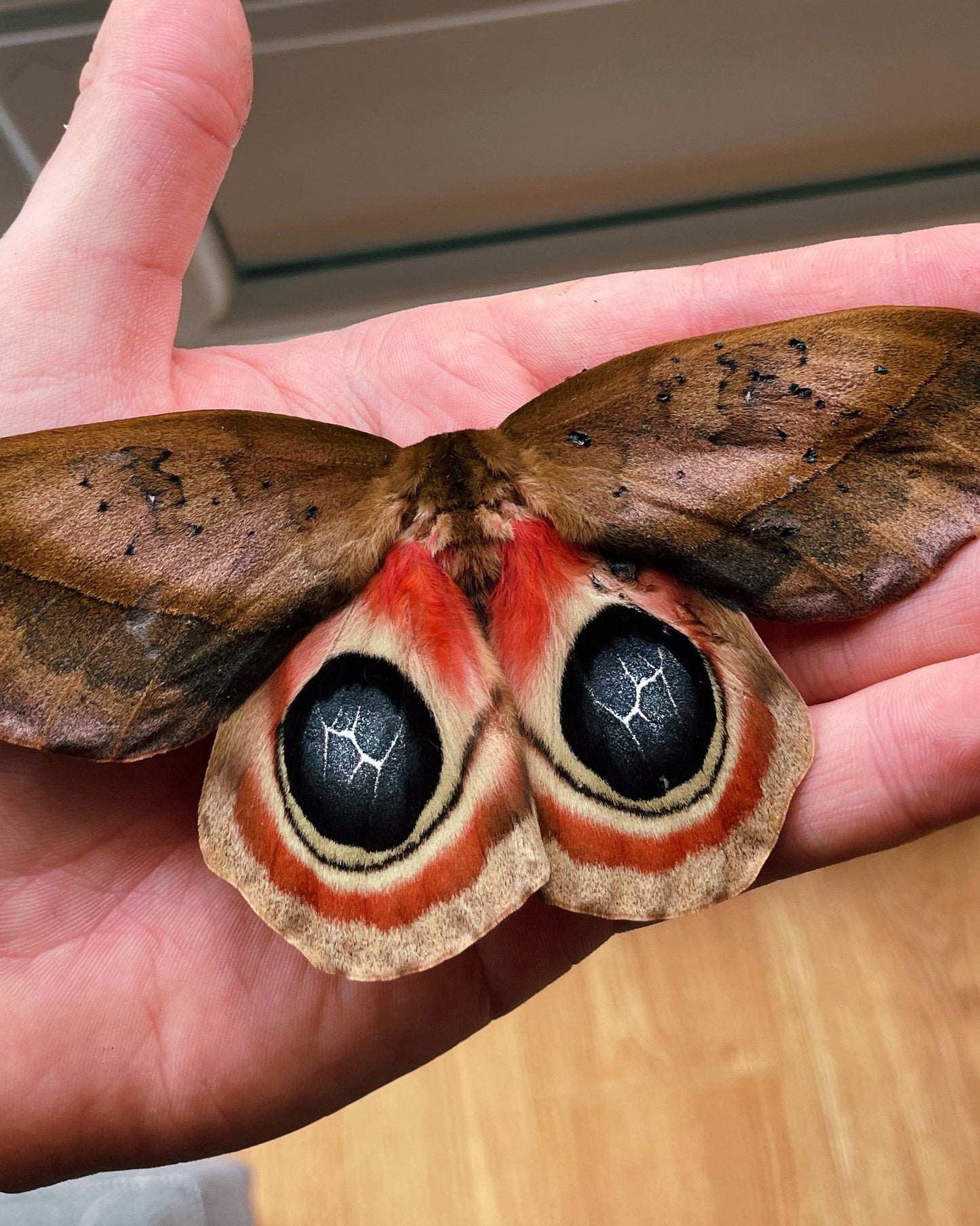 The forewings of Automeris metzli are typically brown or gray, allowing the moth to blend into tree bark or leaves during rest. However, the hindwings are vividly colored, in bright shades of red, with large, eye-like patterns in black and blue. When threatened, the moth rapidly reveals these hindwings, startling potential predators and mimicking the appearance of a larger animal. It is also one of the largest Automeris with a broad wingspan.