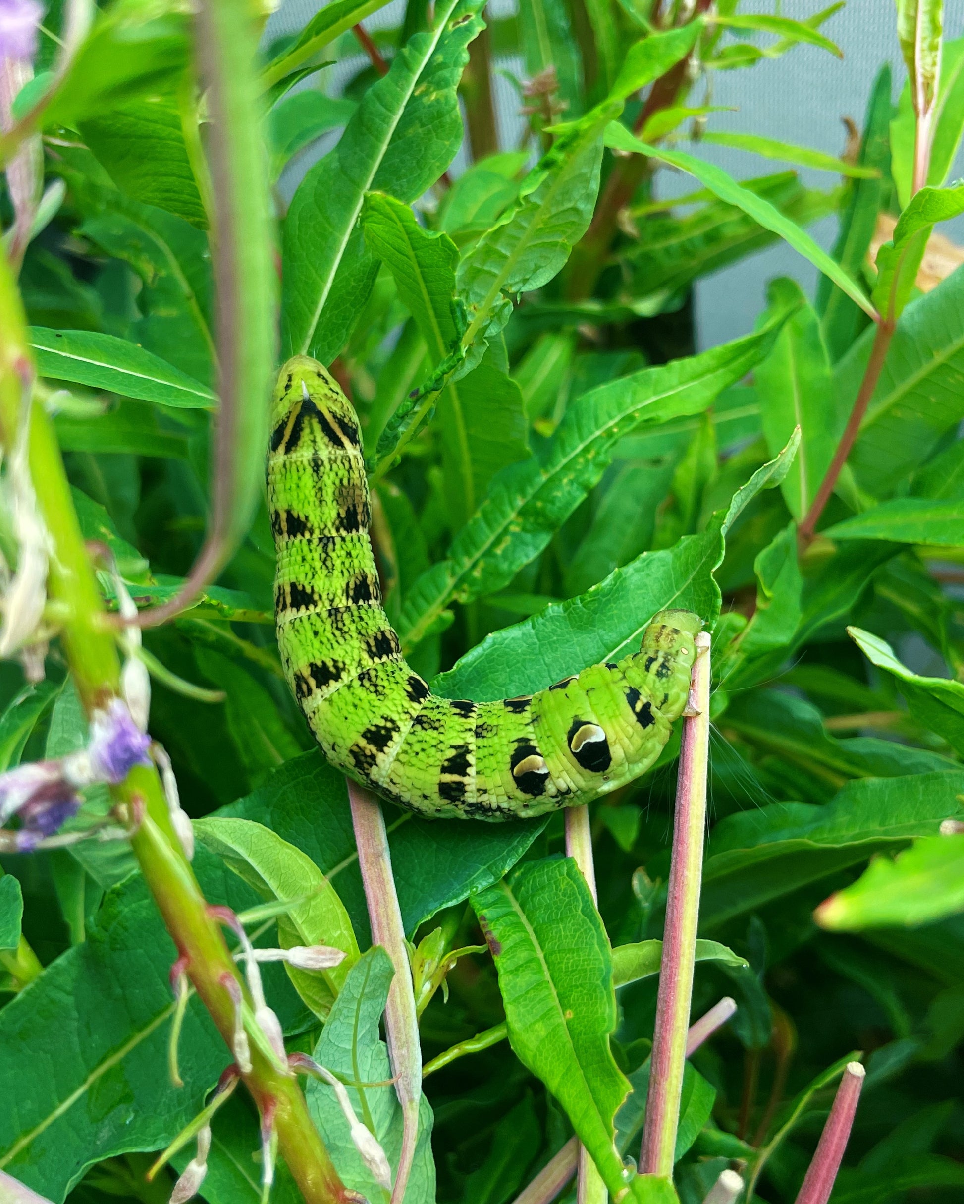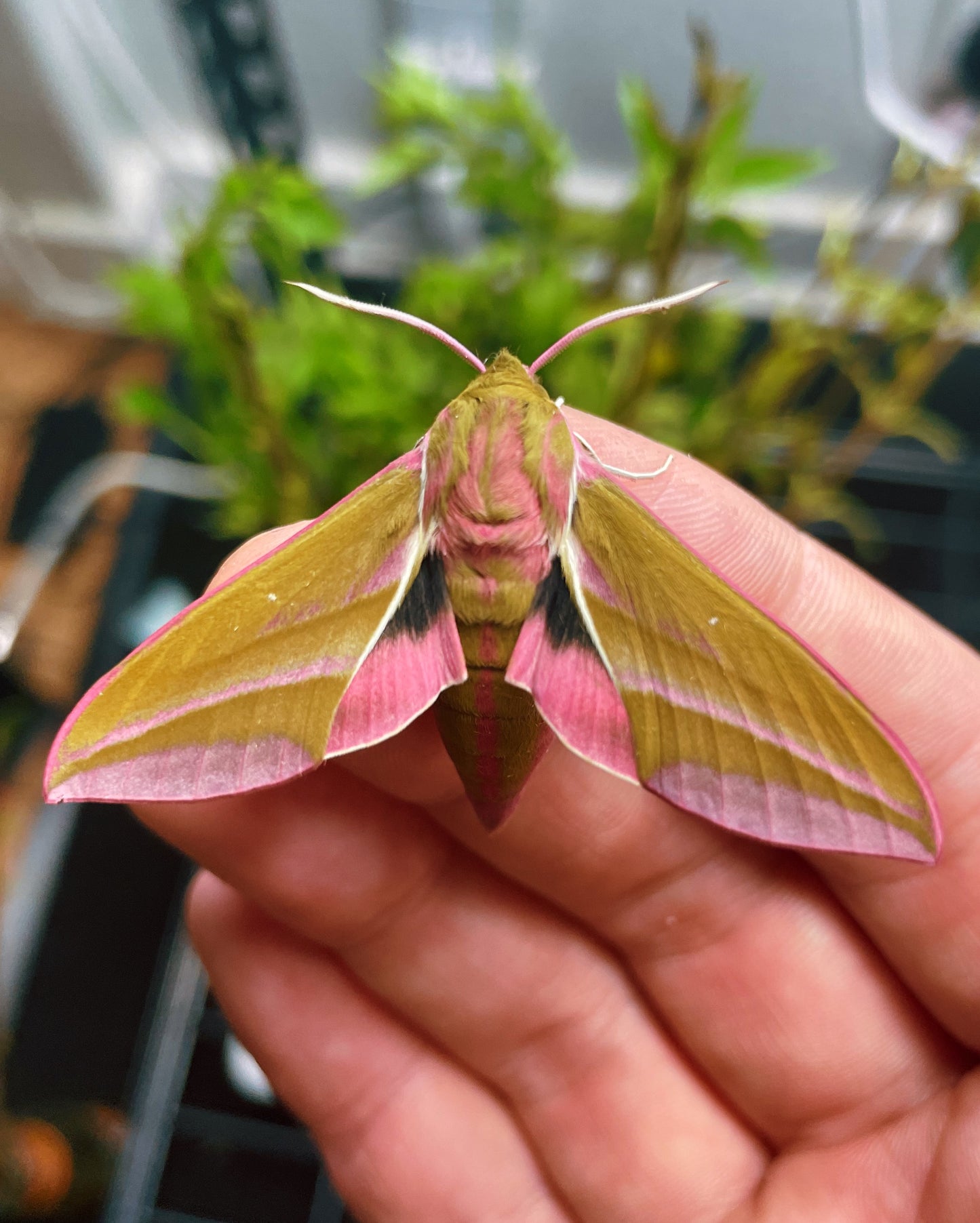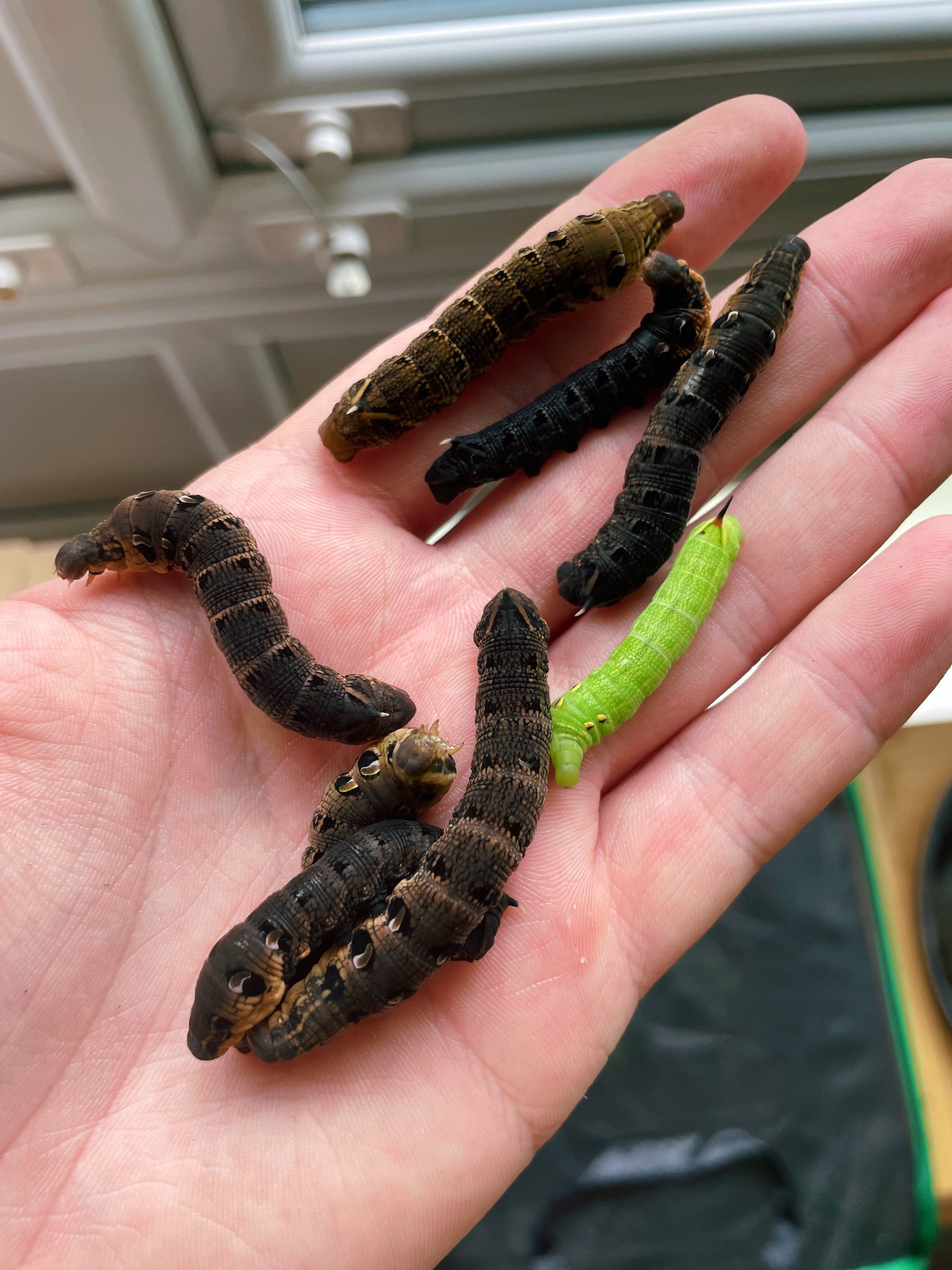 The caterpillars of Deilephila elpenor are equally remarkable, growing up to 8cm in length. They have a distinctive appearance with an "elephant trunk" shape at the head, a feature that provides protection against predators. The larvae are typically green or brown, with large eye spots on the body to mimic a snake’s face, further deterring potential threats. They feed on plants such as willowherb and fuchsia before burrowing and pupating in the soil.