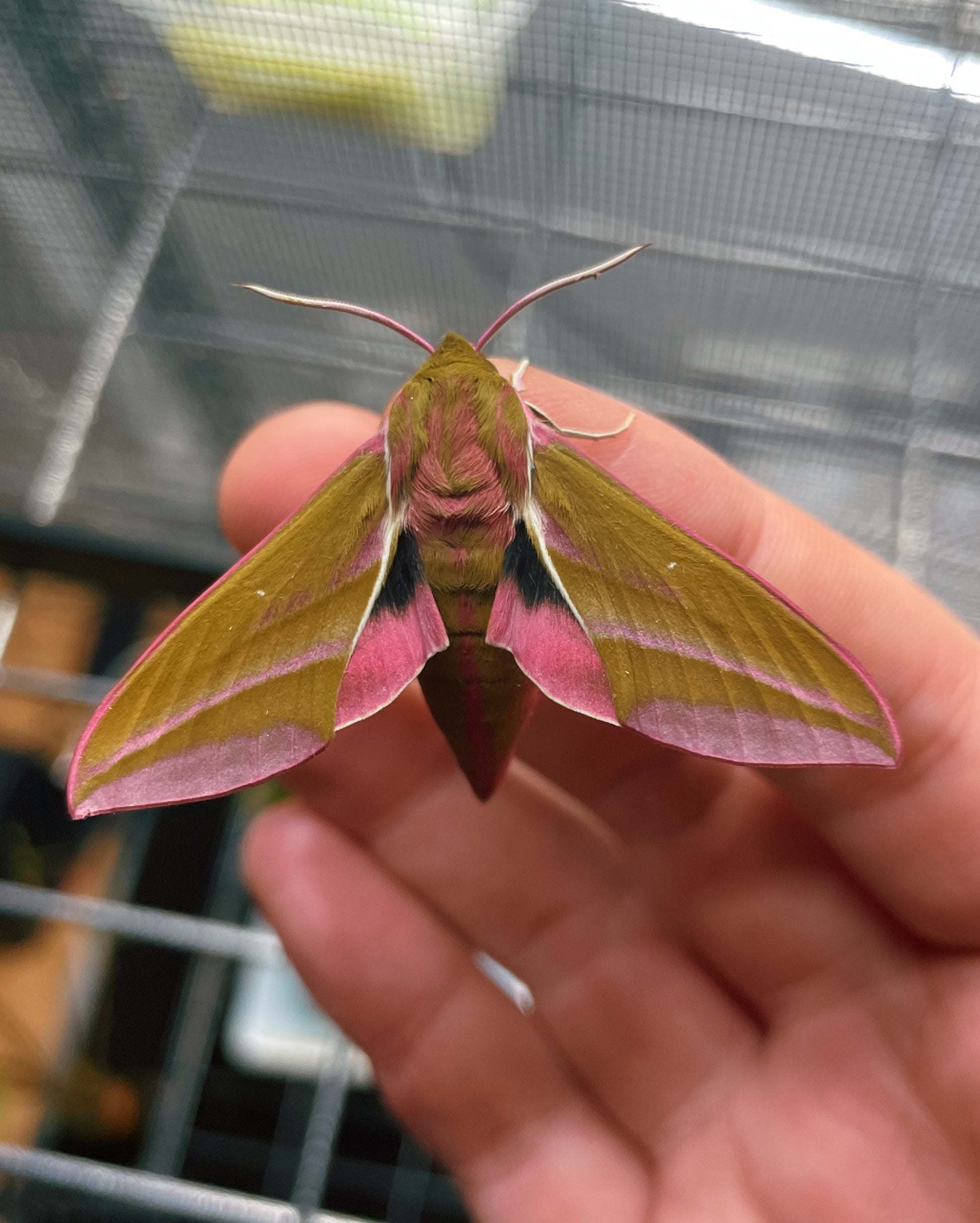The Elephant Hawk Moth (Deilephila elpenor) is a striking, colorful moth in the Sphingidae family, found across Europe. Its adult form is notable for its vivid pink and olive-green coloration, with a wingspan ranging from 50–70 mm. The forewings are olive-green with a pinkish hue, while the hindwings are bright pink with dark borders, creating a beautiful contrast. The moth is nocturnal and feeds on nectar from various flowers, such as honeysuckle and jasmine, using its long proboscis.