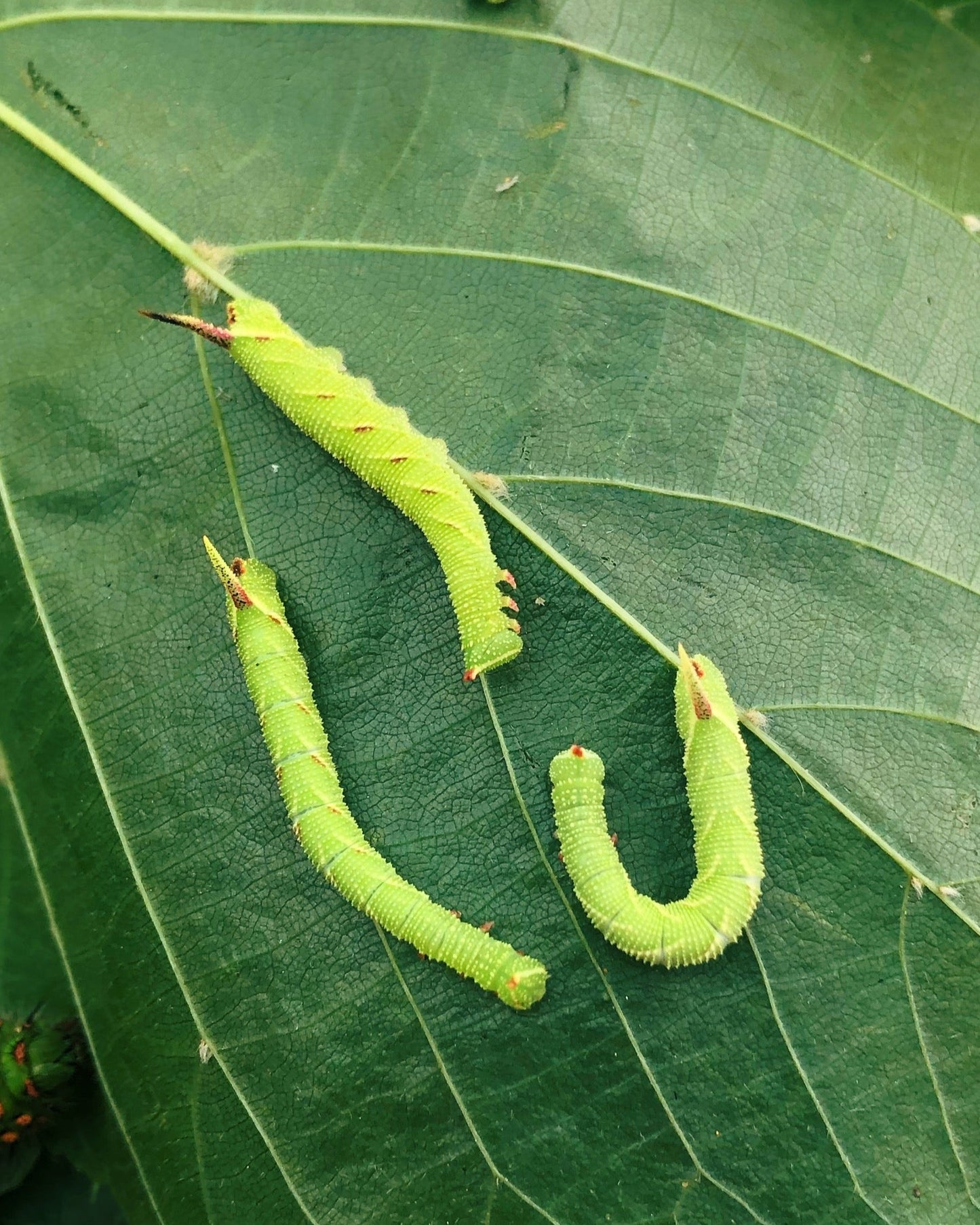 The caterpillars are bright green with diagonal white stripes and a distinctive curved "horn" at the tail end, a characteristic feature of many hawk-moth larvae. They feed on the leaves of host trees and grow to a substantial size before pupating in the soil. Caterpillars pupating early in the summer typically emerge as moths the same year, in late summer or early autumn, whilst those that pupate later will typically overwinter and emerge the following spring.