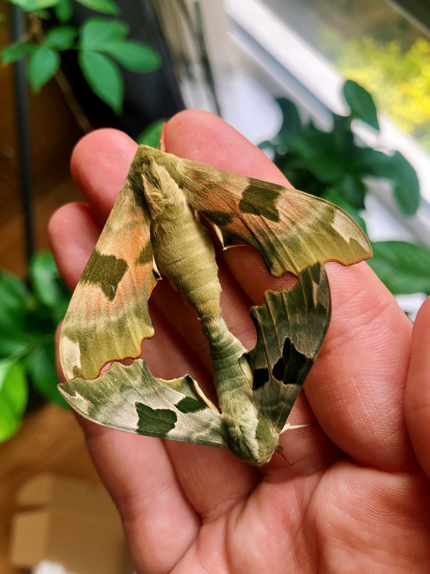 The adult lime hawk-moth has a wingspan of 5–7 cm and displays beautiful, cryptic coloration. Its forewings are a mix of olive green, brown, and pinkish tones, with a pattern resembling lichen-covered bark, providing excellent camouflage. Unlike many hawk-moths, it is not a particularly strong flier and is primarily active at night, resting during the day on tree trunks or branches. Curiously, the adults can occur in a variety of colours other than green, often including rusty browns or even reds, and several aberrant forms have also been described.