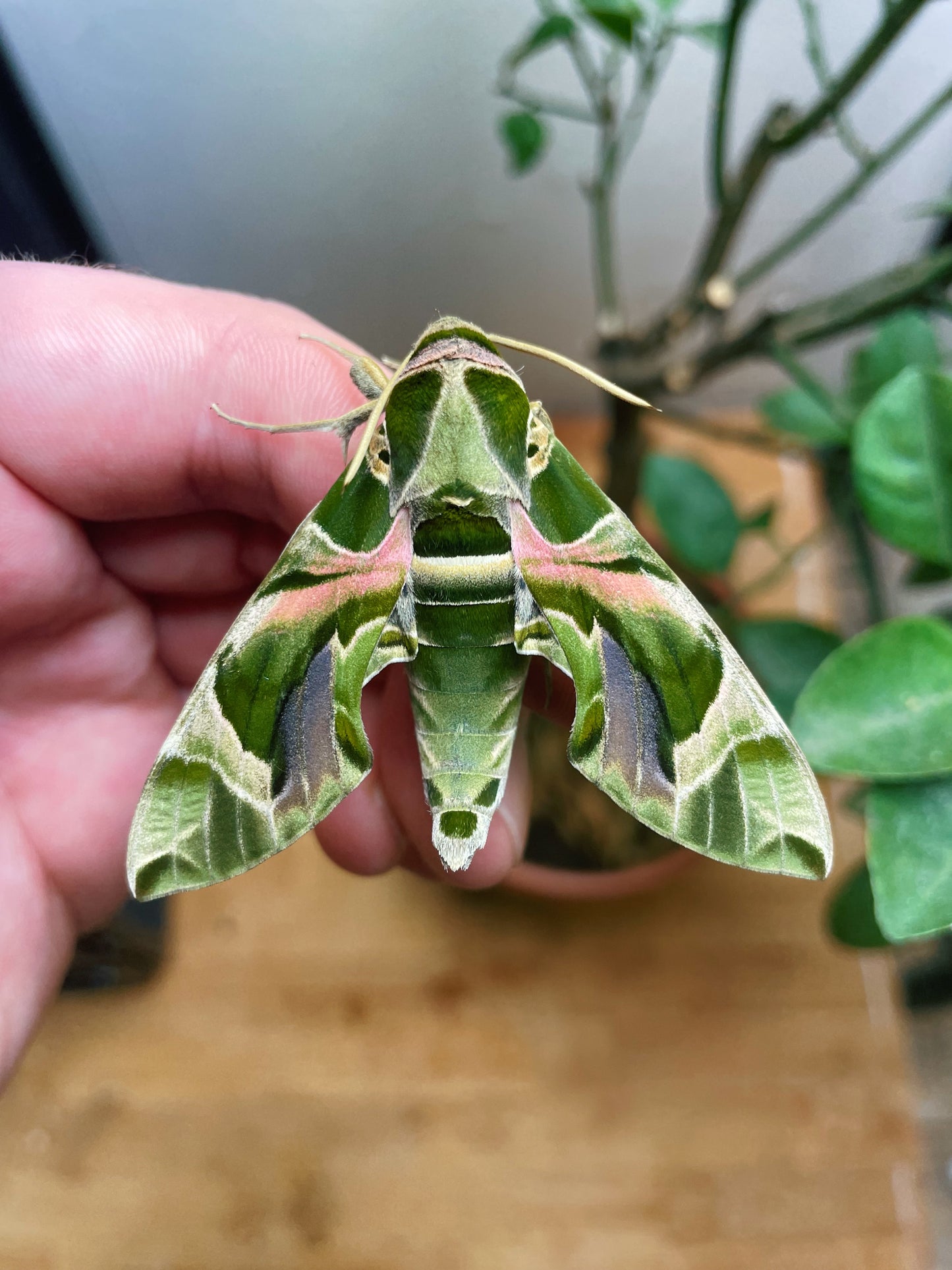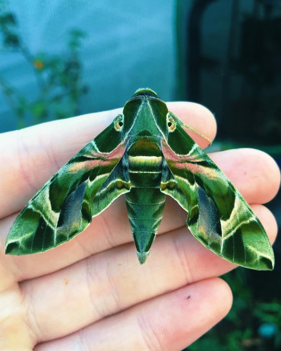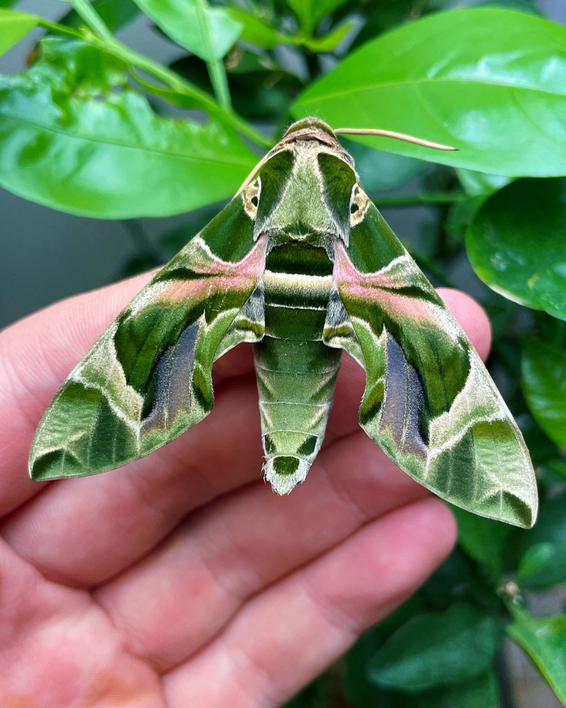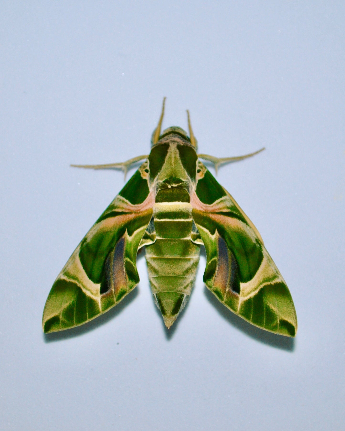 As an adult, Daphnis nerii is a nocturnal nectar feeder, pollinating a variety of flowers during its flights. It is admired for its beauty and role in pollination. This moth is also popular among insect enthusiasts for its striking patterns and relatively easy rearing in captivity.