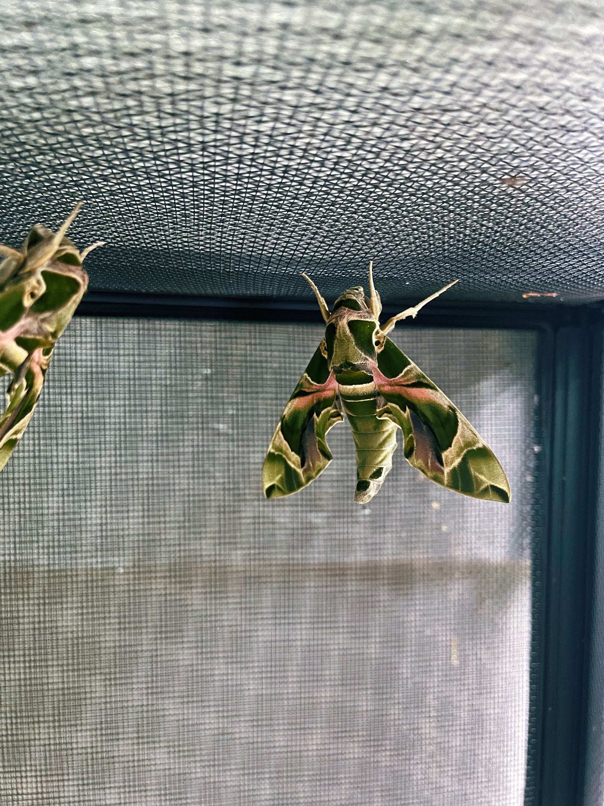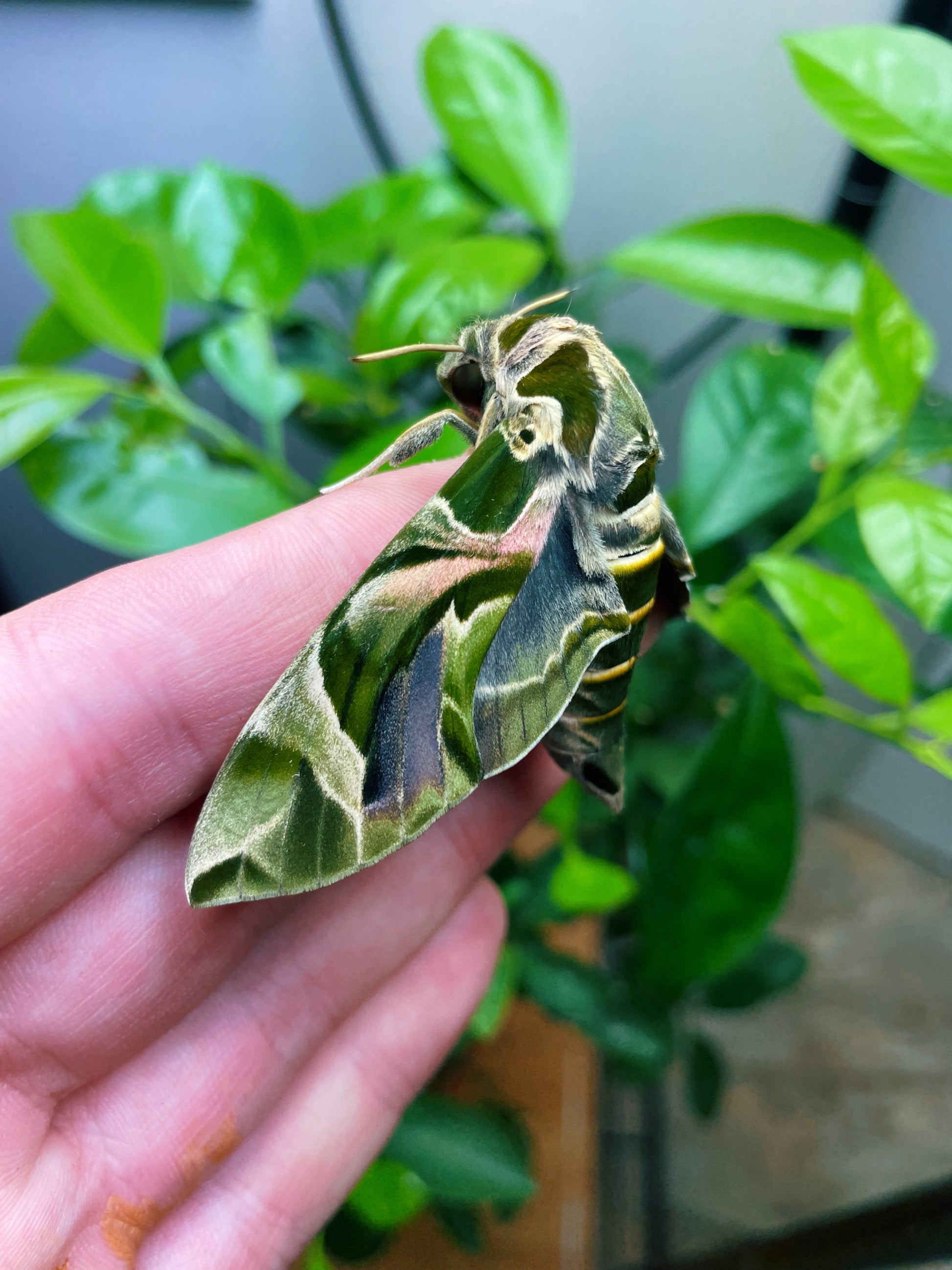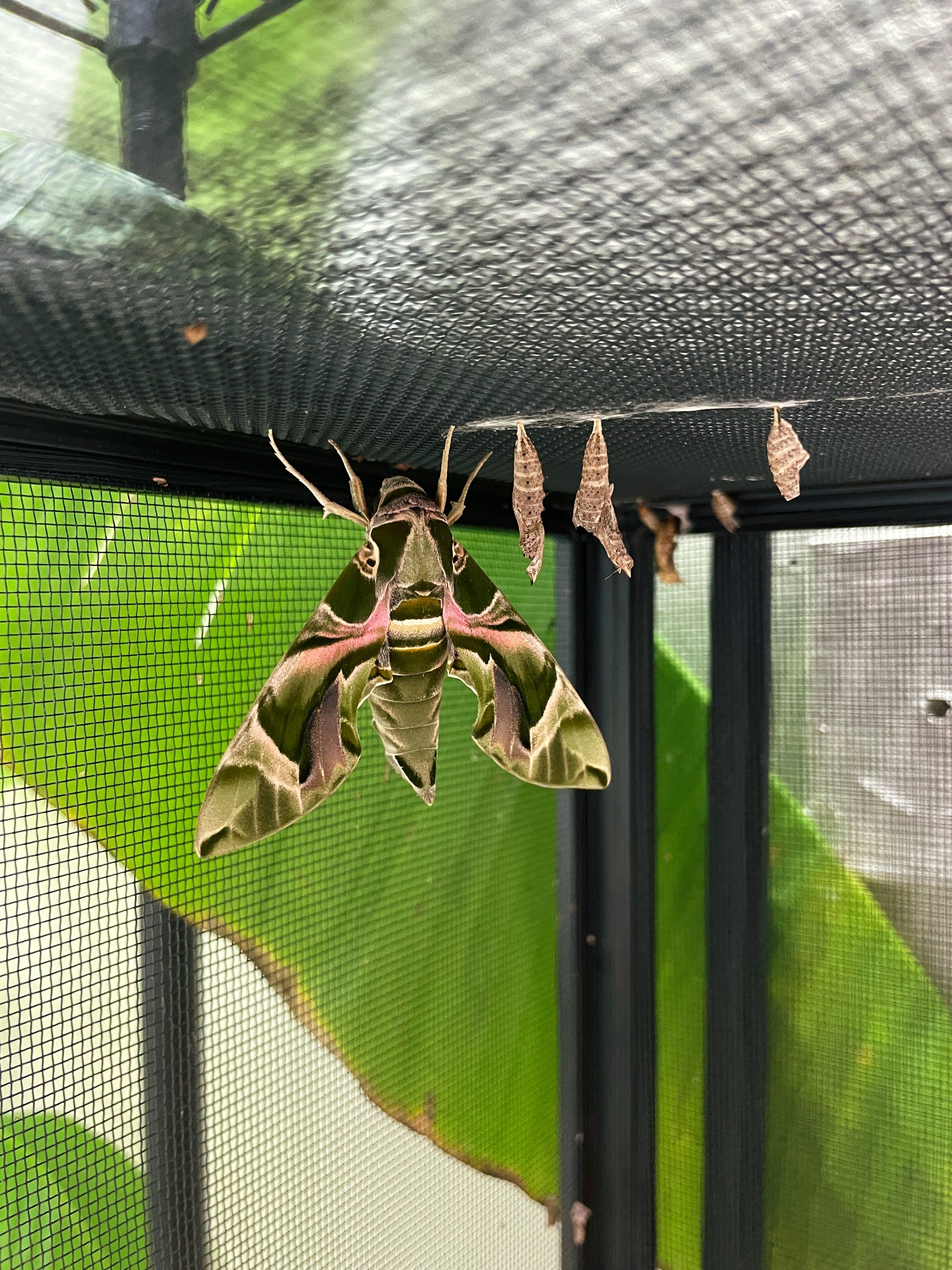 As an adult, Daphnis nerii is a nocturnal nectar feeder, pollinating a variety of flowers during its flights. It is admired for its beauty and role in pollination. This moth is also popular among insect enthusiasts for its striking patterns and relatively easy rearing in captivity.
