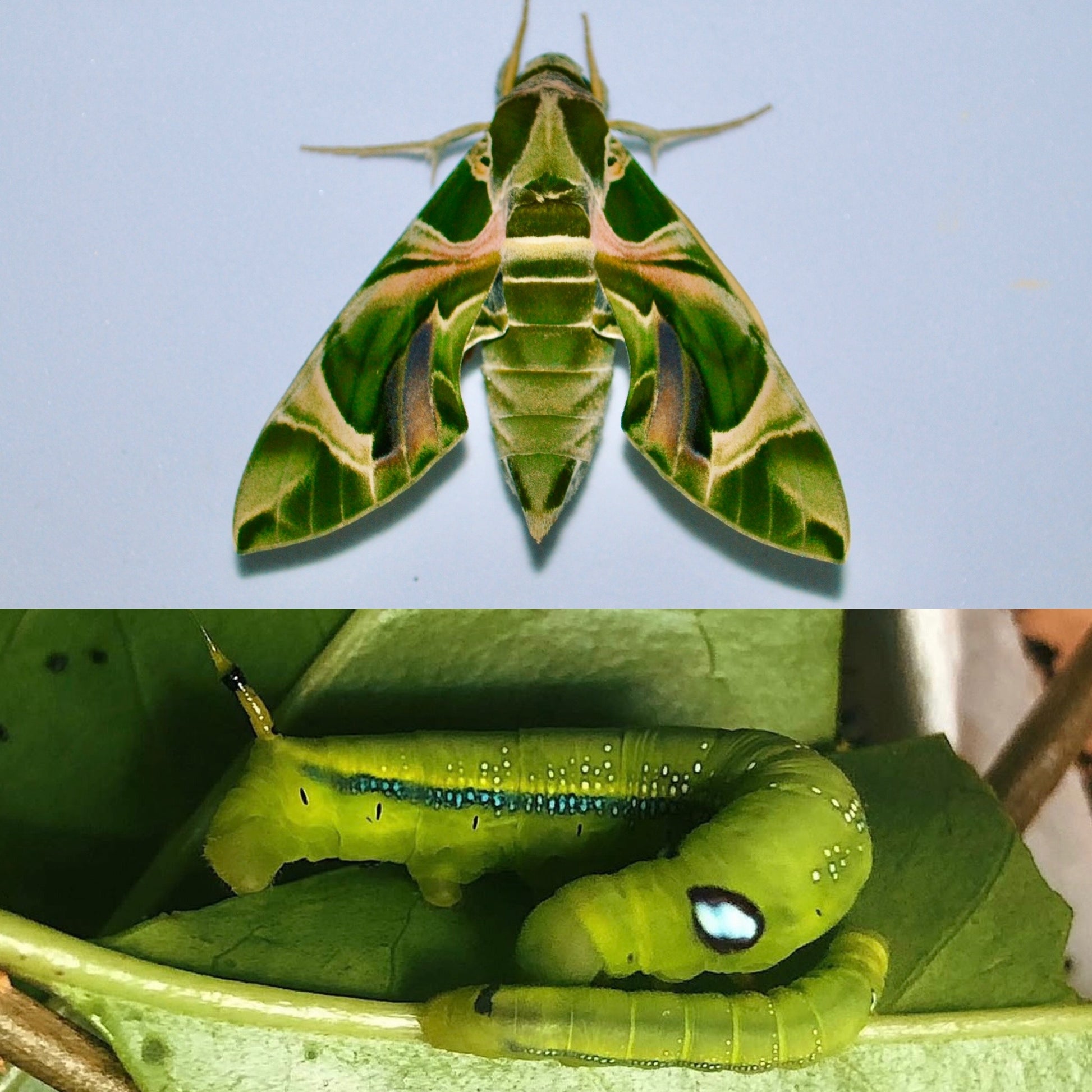 The caterpillars have two distinct colour forms, being either bright green or orange in colour with white and blue eyespots and a curved tail horn, characteristic of hawk-moth larvae. They feed primarily on oleander and periwinkle plants, developing quickly before pupating in the soil. Privet is also accepted in captivity.
