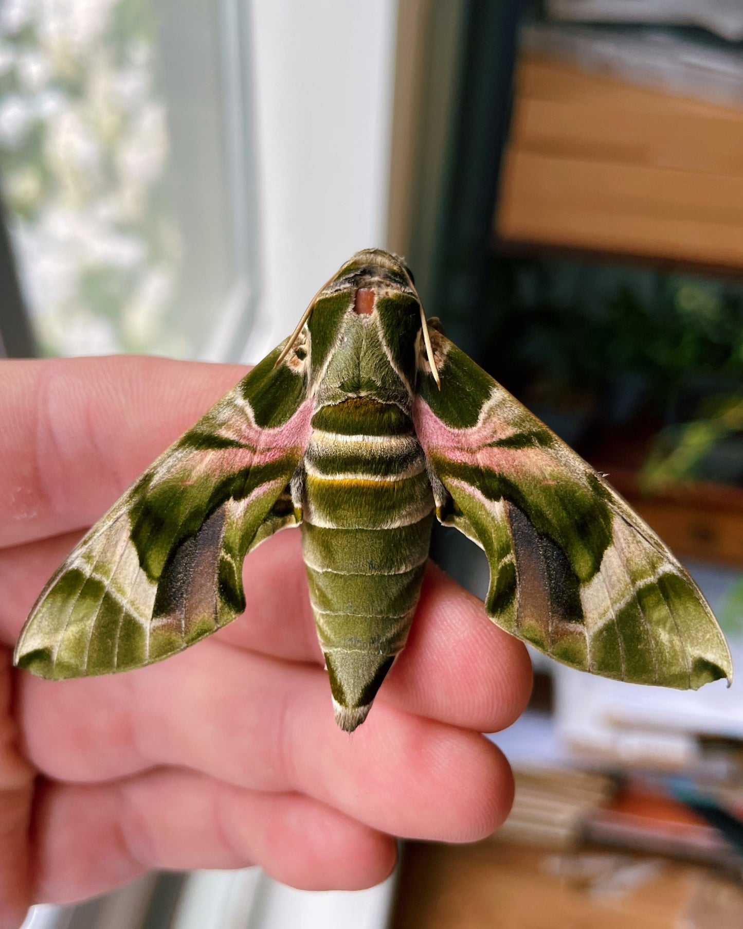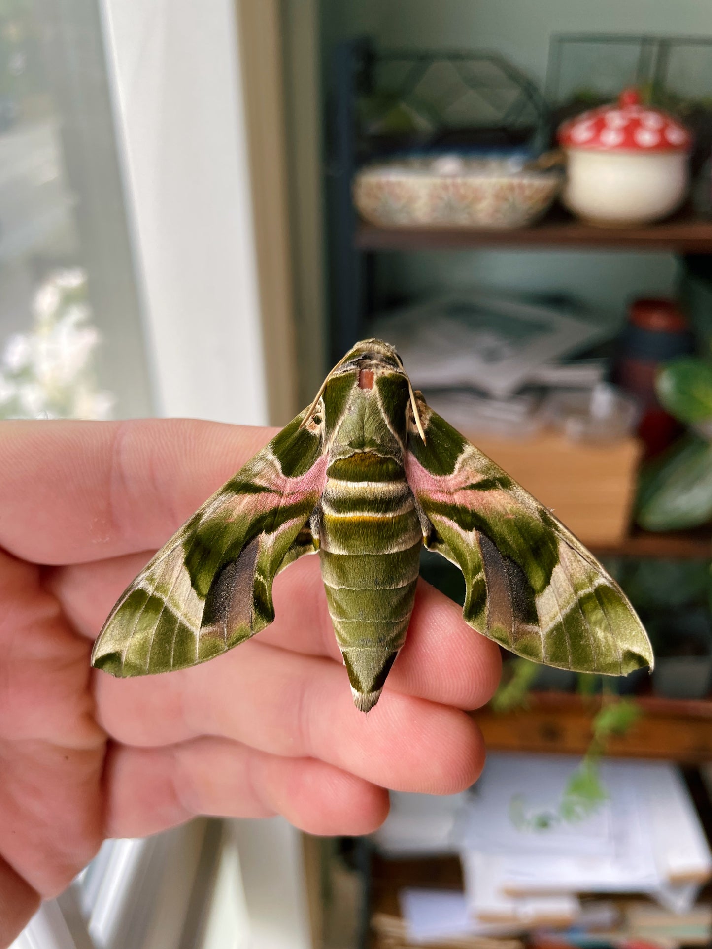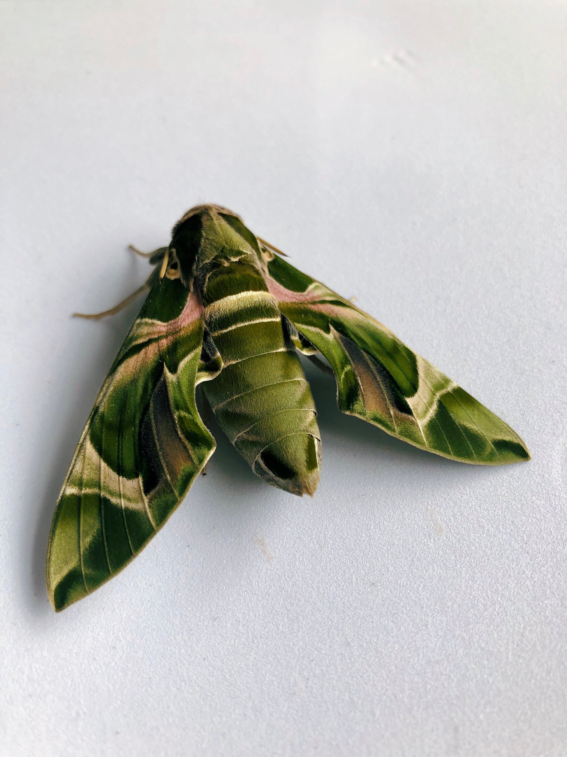 The oleander hawk-moth is renowned for its stunning appearance. Its forewings are intricately patterned with shades of green, olive, and pink, creating a camouflage effect that blends perfectly with foliage. The hindwings are duller but complement the overall coloration. With a wingspan of 8–12 cm, it is a powerful and agile flyer, capable of covering long distances, and is semi-migratory in nature. Very occasionally adult moths are found in the UK, likely to have flown from mainland Europe during warm summers.