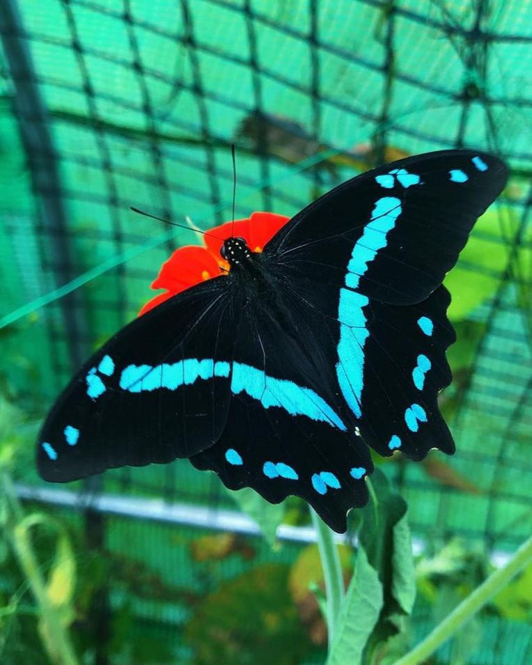 The wings of Papilio nireus are jet black with vibrant turquoise or blue-green bands that run diagonally across the forewings and continue as spots on the hindwings. The hindwings have a scalloped edge and may feature subtle tails, a characteristic trait of many swallowtails. The vivid green bands provide a striking contrast, making this butterfly a visual standout in its natural habitat.