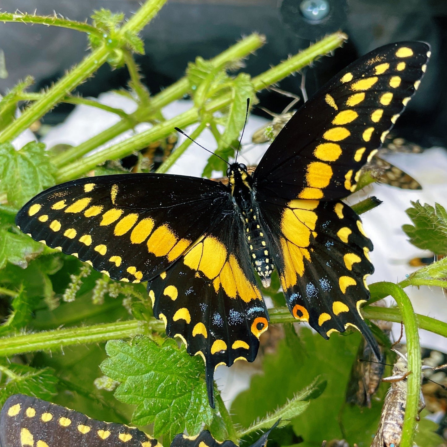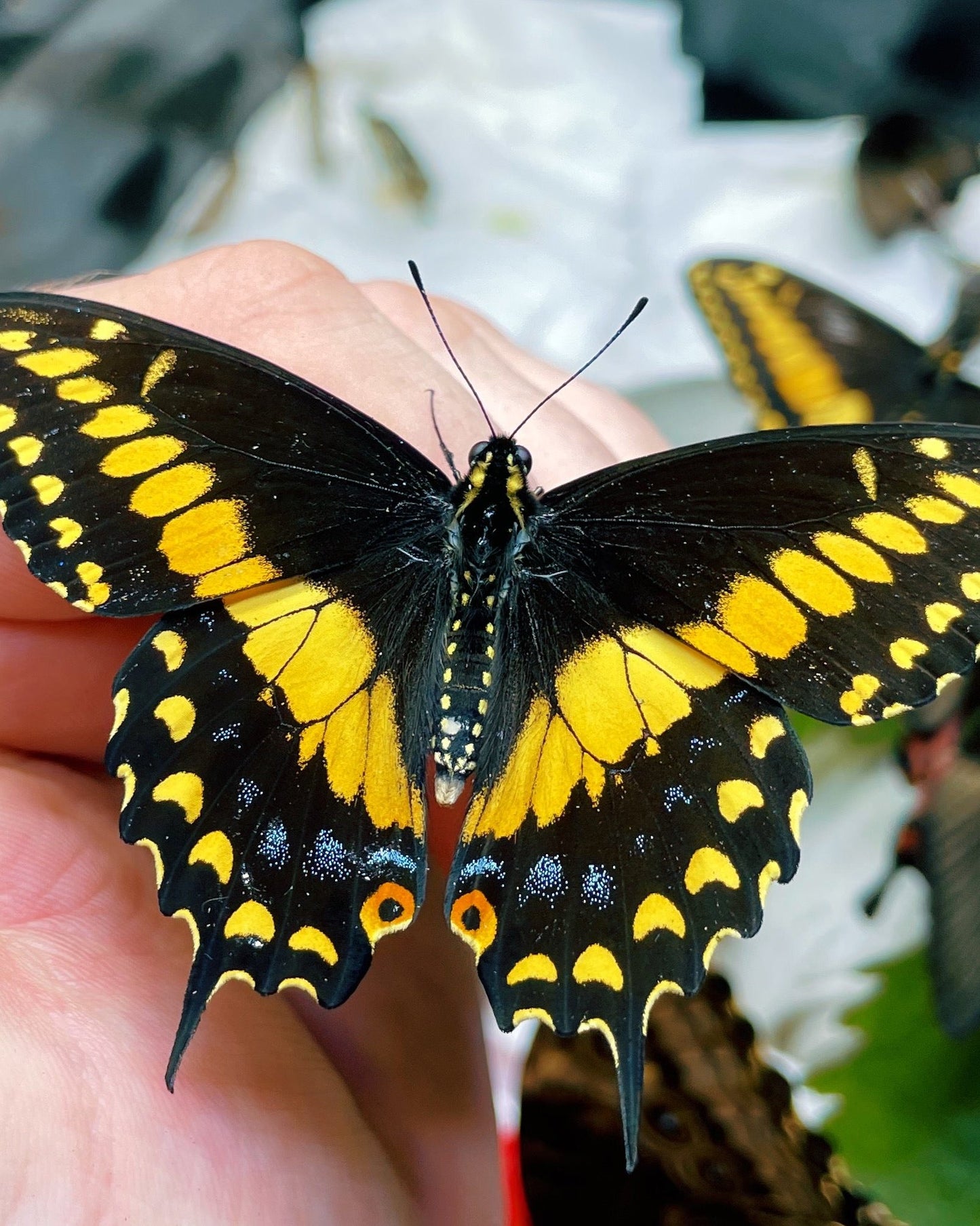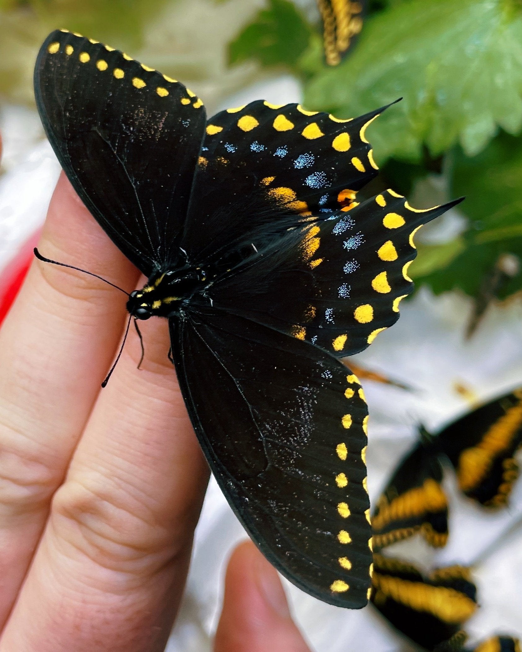 Papilio polyxenes stabilis closely resembles other subspecies of the Black Swallowtail. Its wings are predominantly black with bold yellow and blue markings. The forewings feature rows of yellow spots, while the hindwings display vibrant blue patches and a distinct orange-red eyespot near the base. Unlike some other swallowtail butterflies, the tail-like extensions on the hindwings are more subdued or slightly shorter in this subspecies.