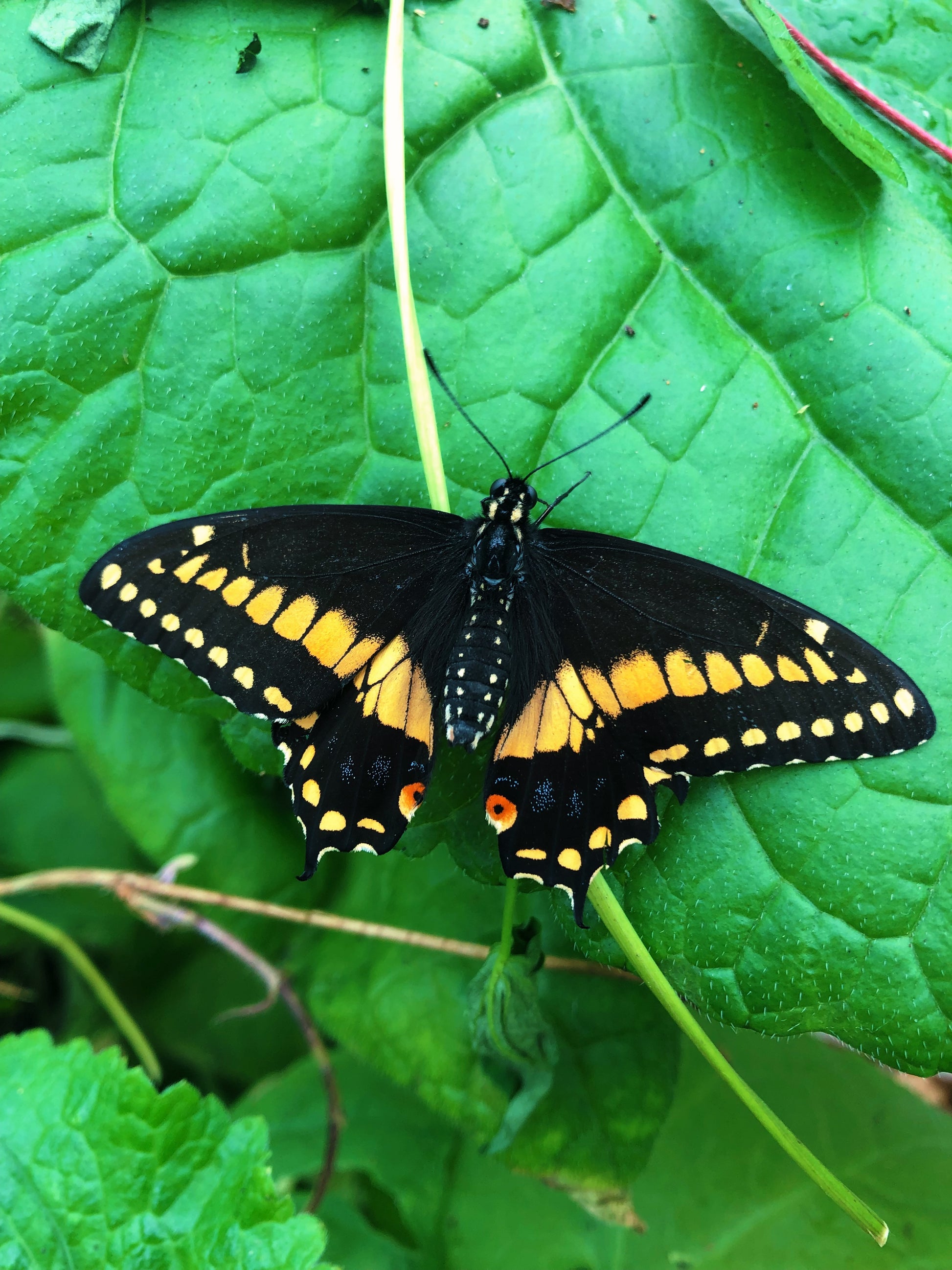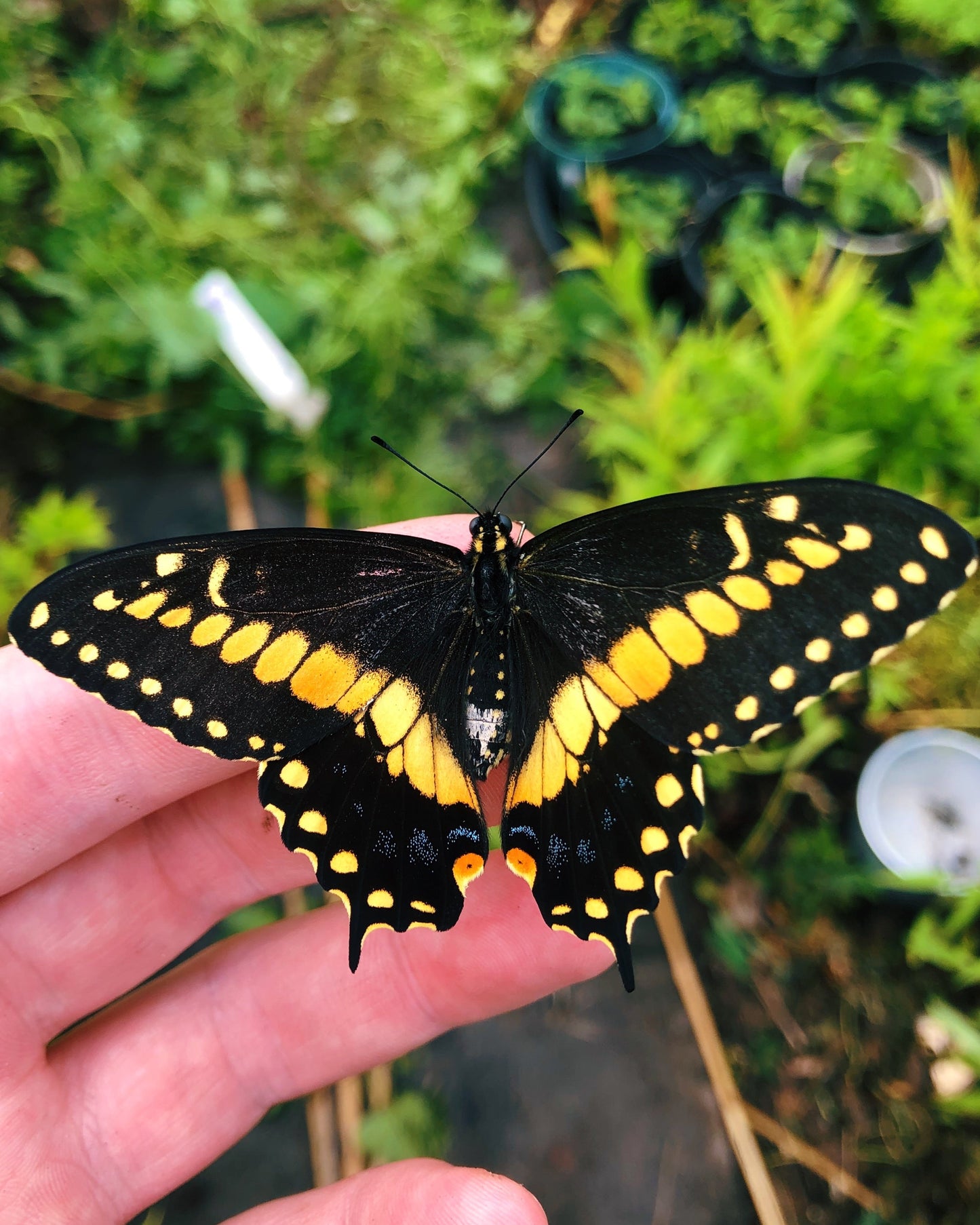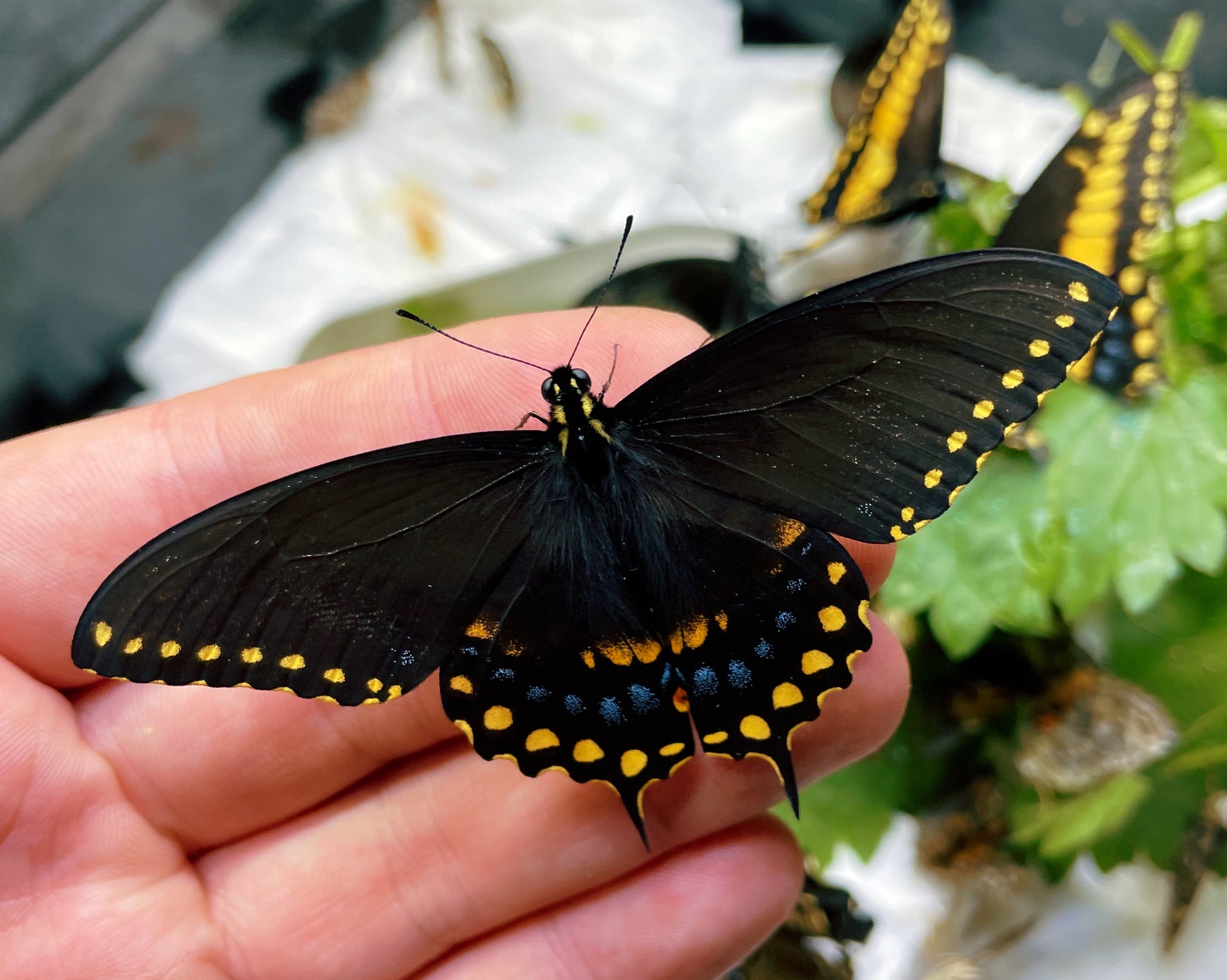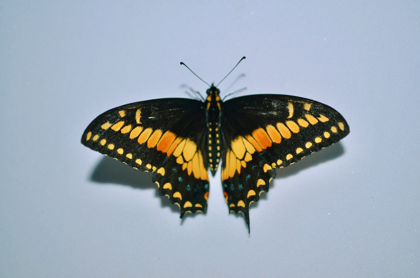 Papilio polyxenes stabilis closely resembles other subspecies of the Black Swallowtail. Its wings are predominantly black with bold yellow and blue markings. The forewings feature rows of yellow spots, while the hindwings display vibrant blue patches and a distinct orange-red eyespot near the base. Unlike some other swallowtail butterflies, the tail-like extensions on the hindwings are more subdued or slightly shorter in this subspecies.