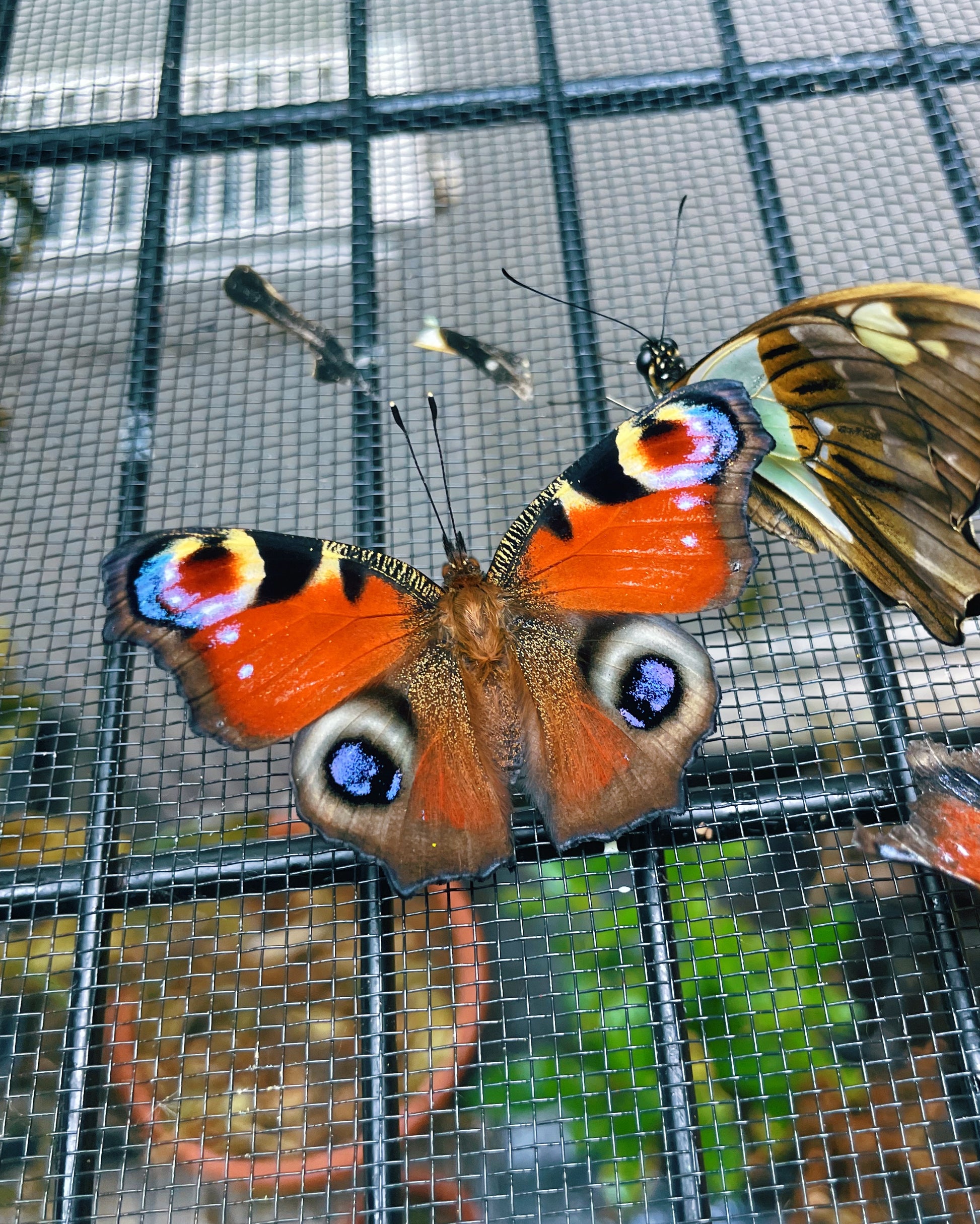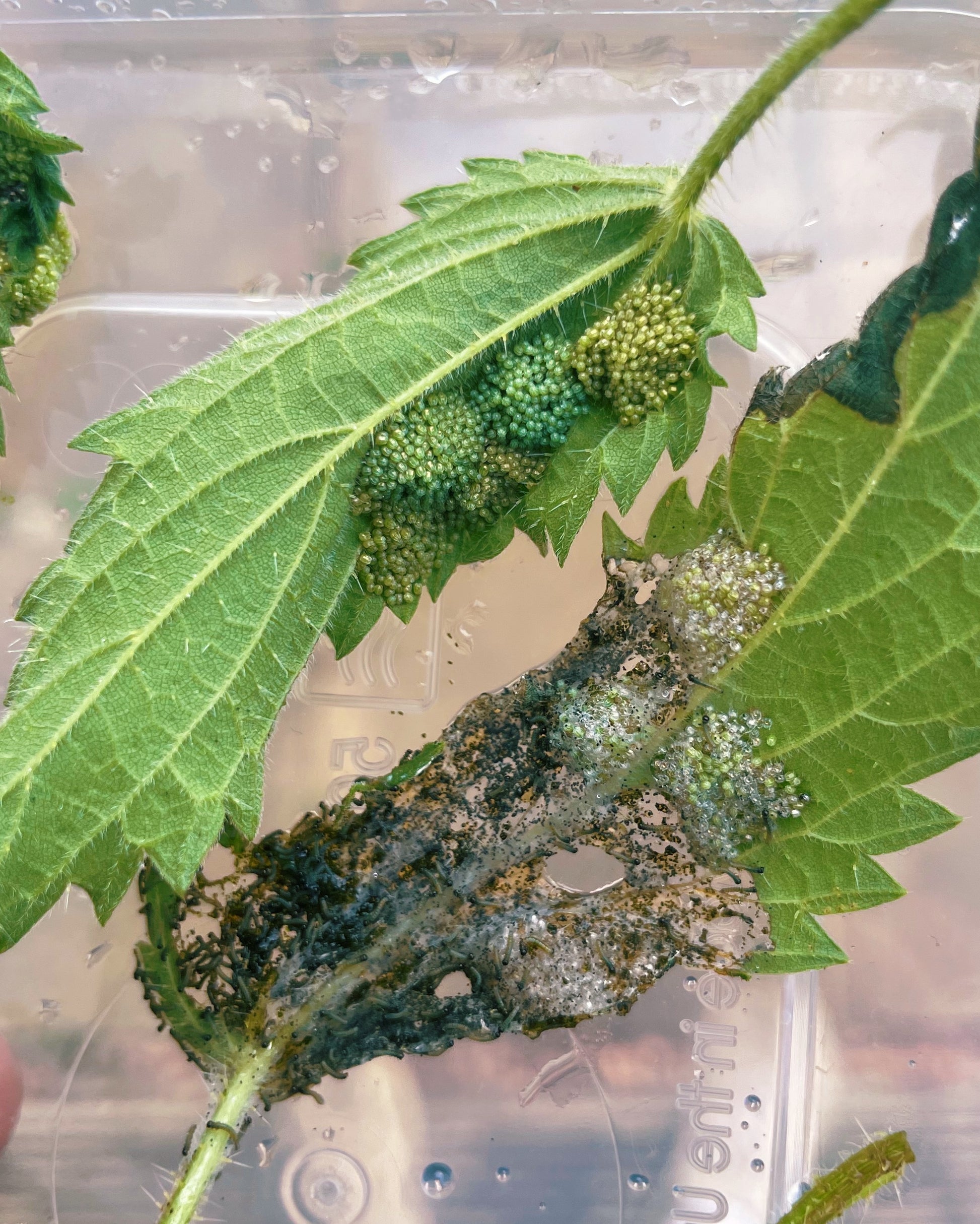 The Peacock butterfly thrives in various habitats, including gardens, woodlands, meadows, and parks. It is particularly common in areas with an abundance of nettles (Urtica dioica), the only host plant for its larvae. Females lay clusters of eggs on the underside of nettle leaves, and the caterpillars, which are black with spines and white spots, feed on the foliage before pupating.