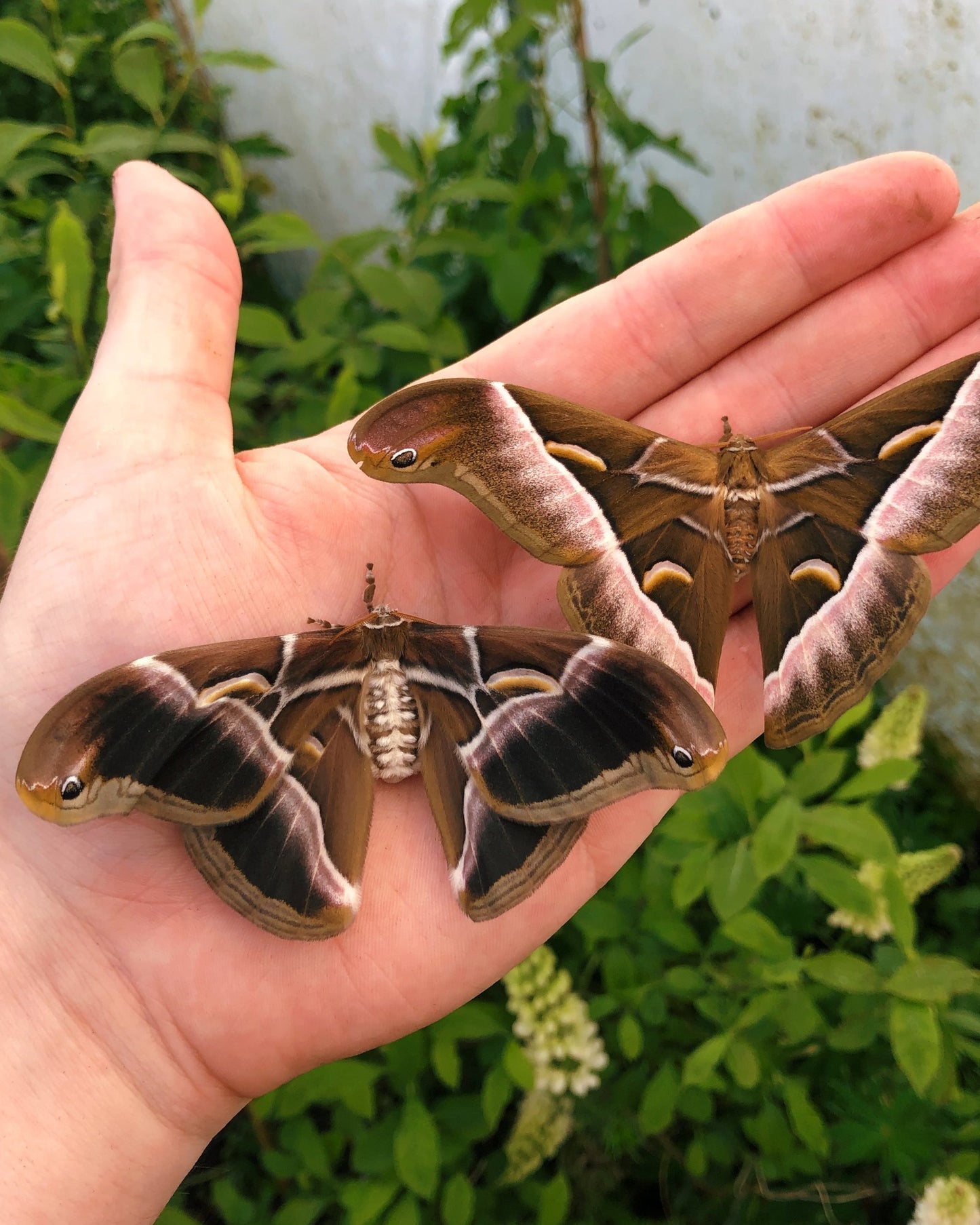 The larvae, or caterpillars, are pale green, blue or white and have small, soft spines along their bodies. They feed on a variety of host plants, including the leaves of Privet, and are particularly well known for feeding on the castor plant (Ricinus communis), which gives them their name "ricini." The caterpillars grow large and after about 4-5 weeks spin a silk cocoon that is harvested for its strong, coarse silk. Unlike the domesticated silkworm (Bombyx mori), which produces fine, long strands of silk, the silk of Samia ricini is more textured and is often used to make more durable fabrics.